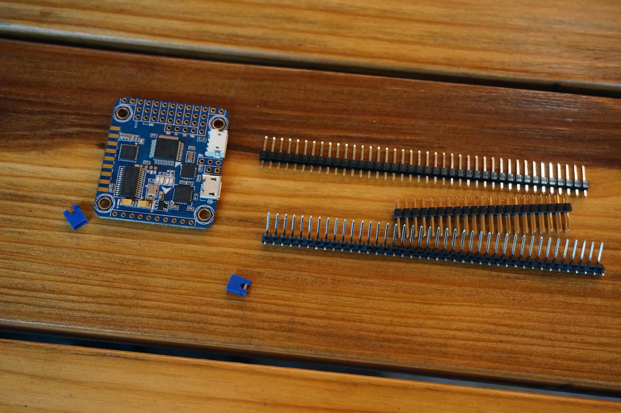 It comes with the manual, pin headers and jumpers for the OSD / Flight controller selection