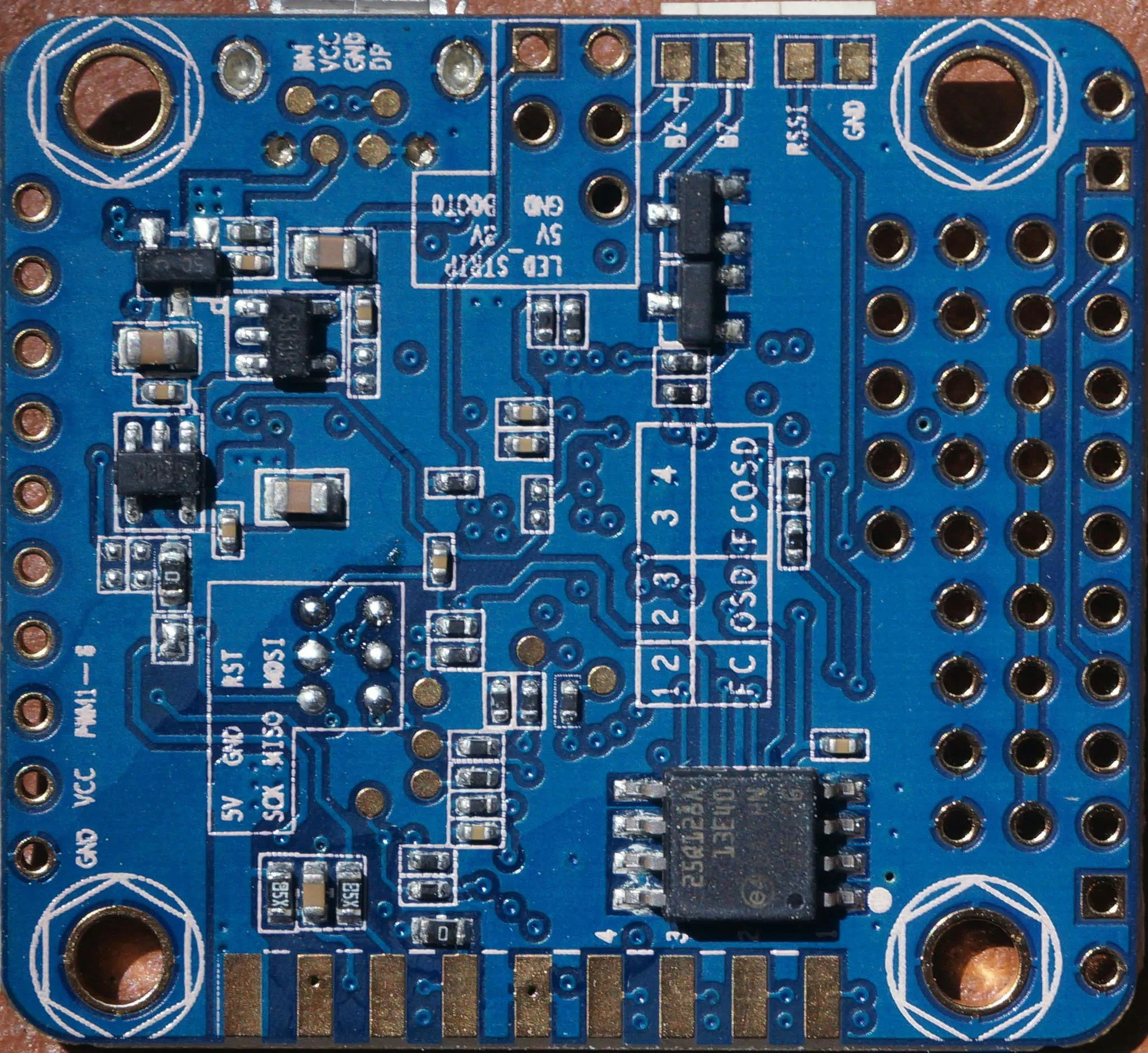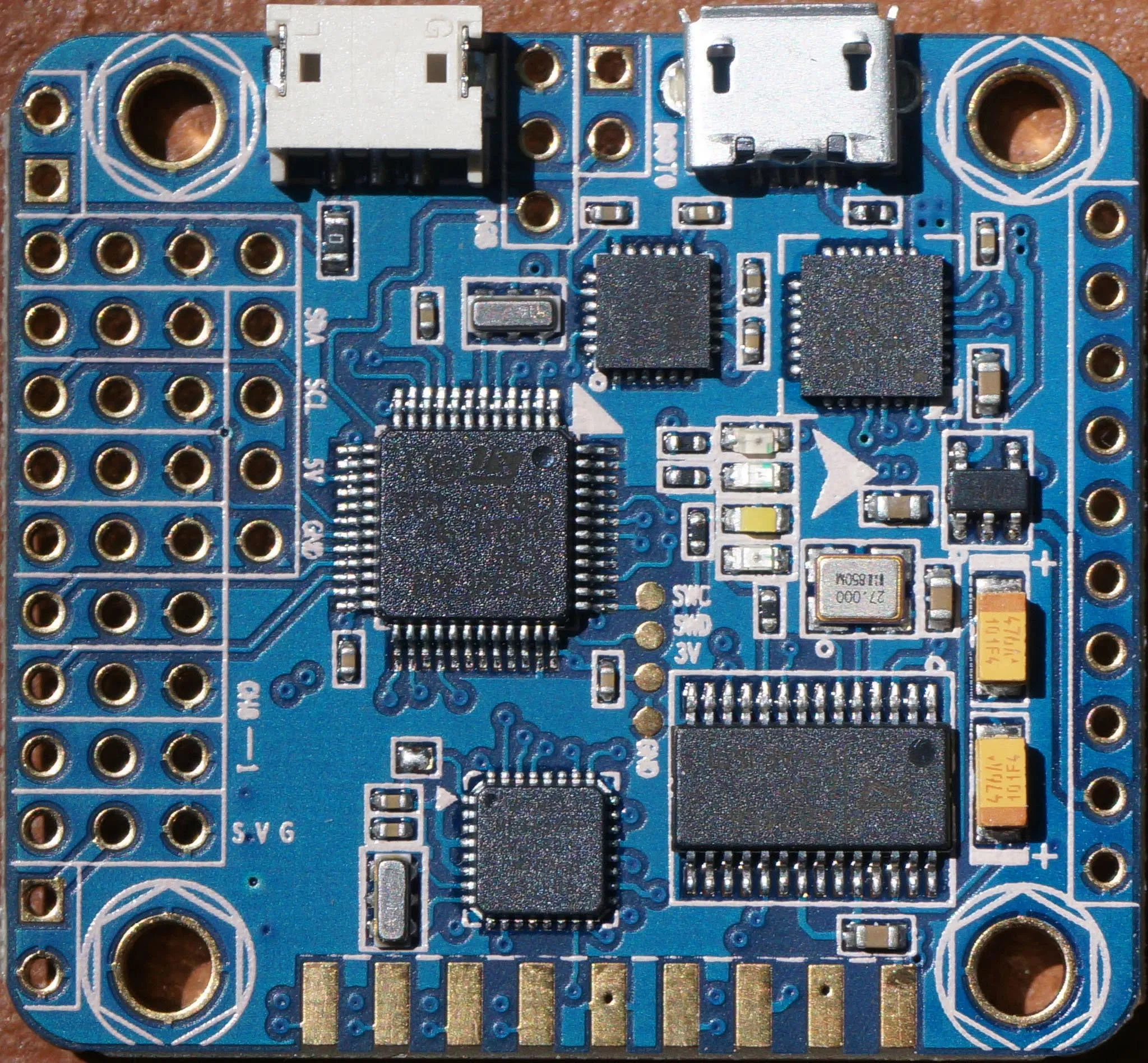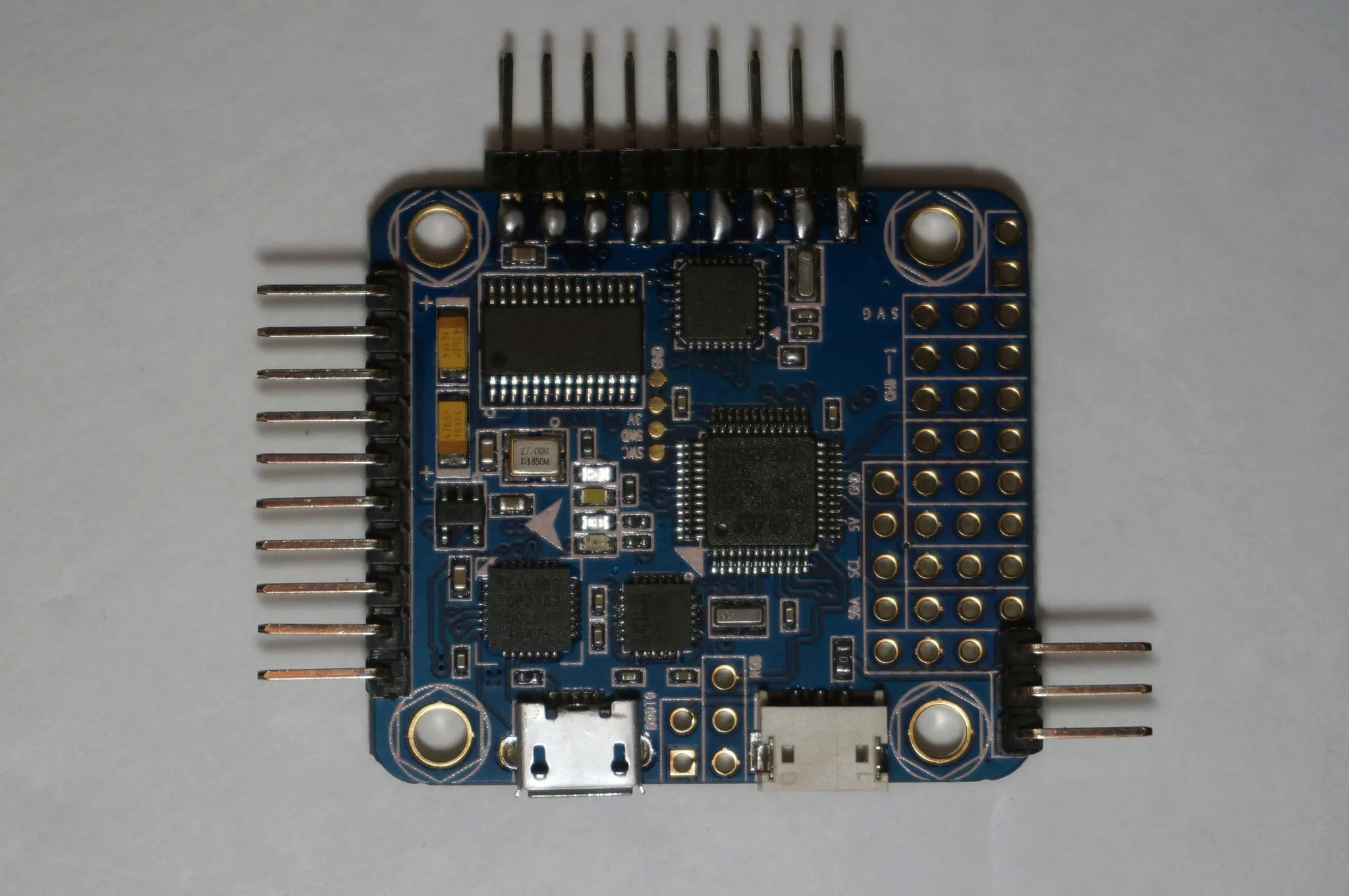 On the front we see the Spektrum Satellite receiver port, USB port, STM32 ST-LINK debugging pins (broken out as pads) and the various 2.54mm header holes which are described in detail below in the connection diagram section.