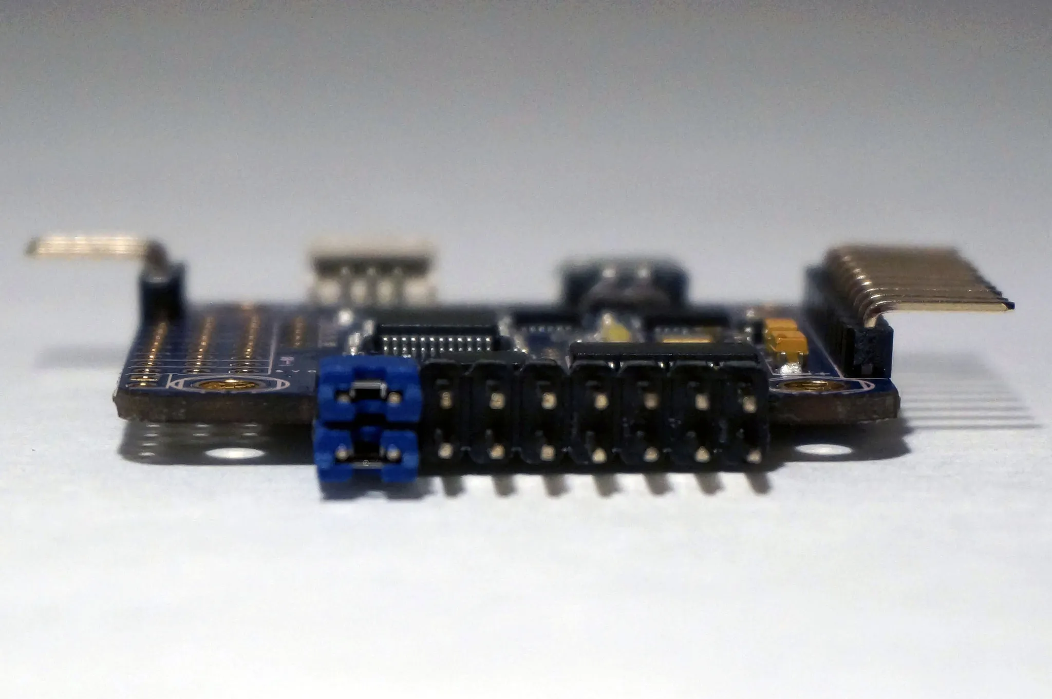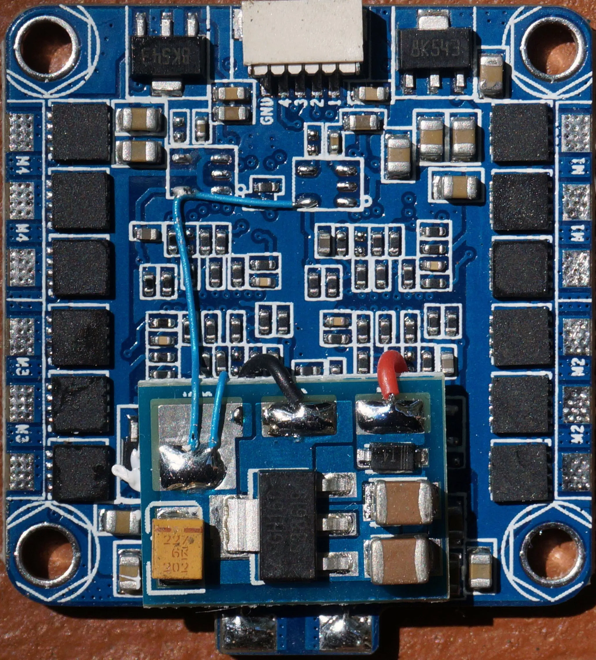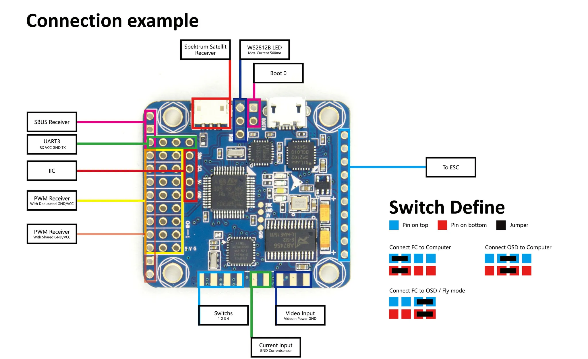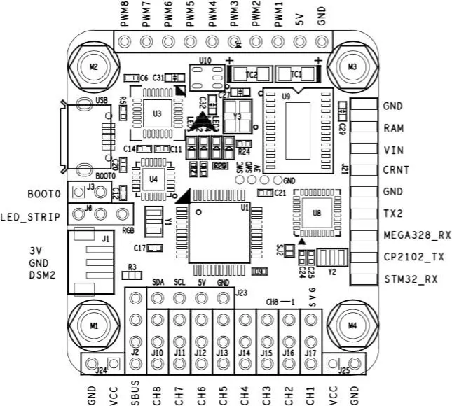 On the front we see the Spektrum Satellite receiver port, USB port, STM32 ST-LINK debugging pins (broken out as pads) and the various 2.54mm header holes which are described in detail below in the connection diagram section.