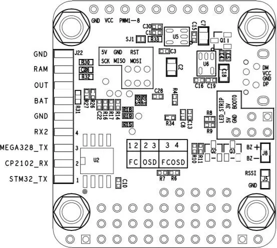 Both RAM pins are connected, allowing power to pass from the video transmitter to the camera. This is also connected to the V_sense line by a 0ohm resistor, which can be removed if you want. I prefer to leave these pins unused and power the camera and VTX separately.