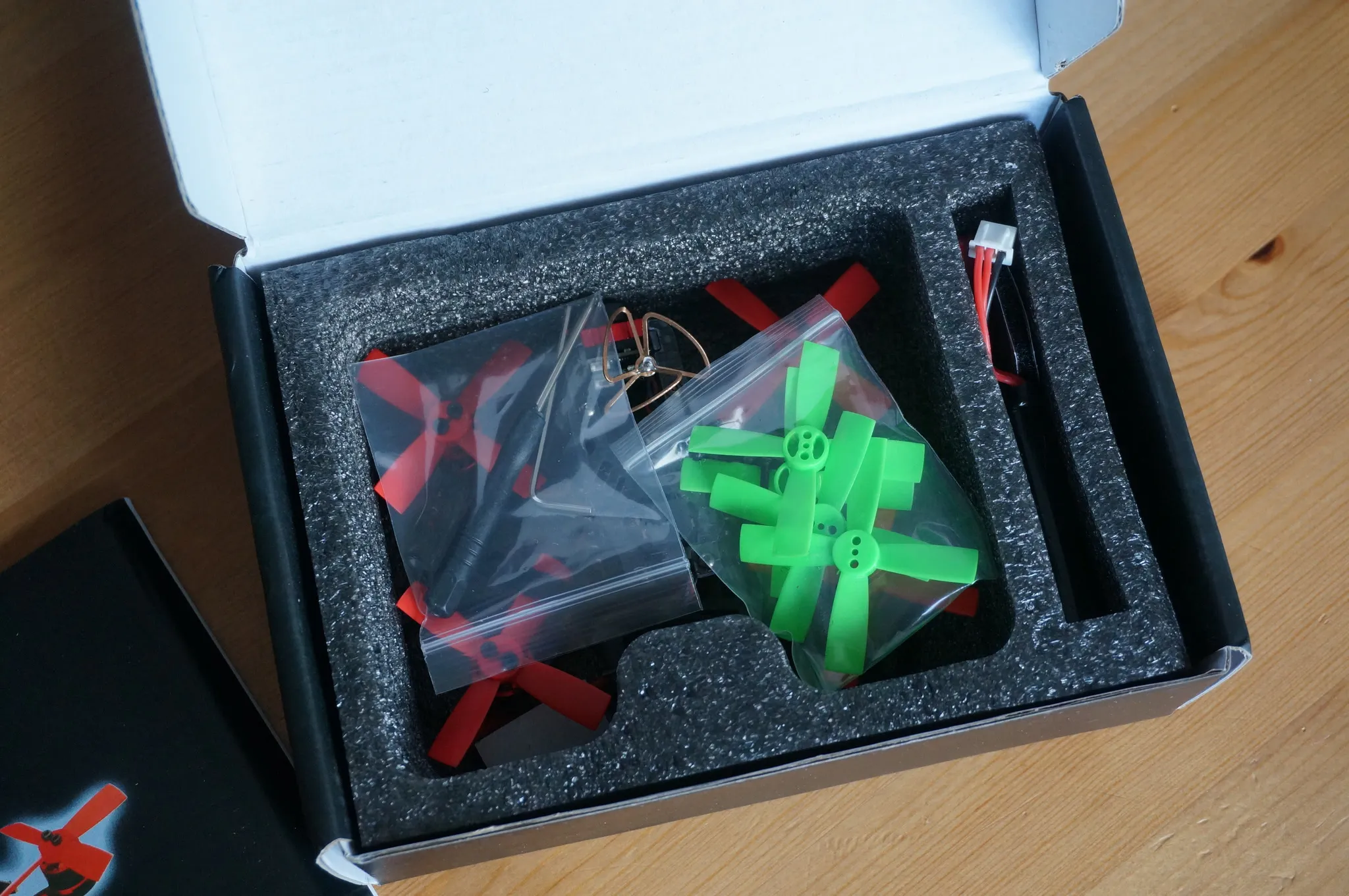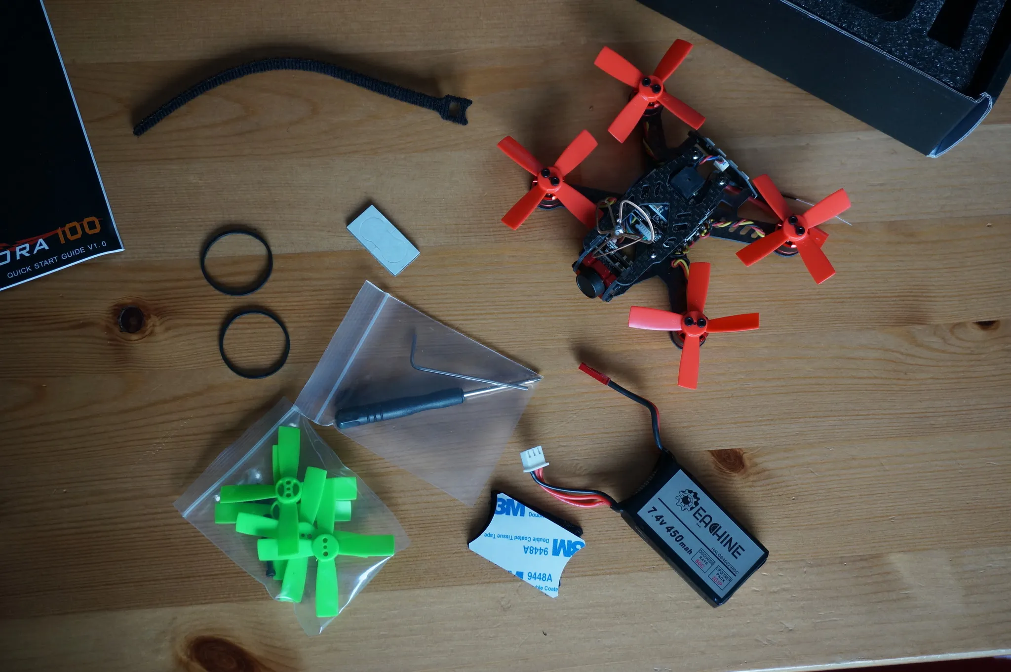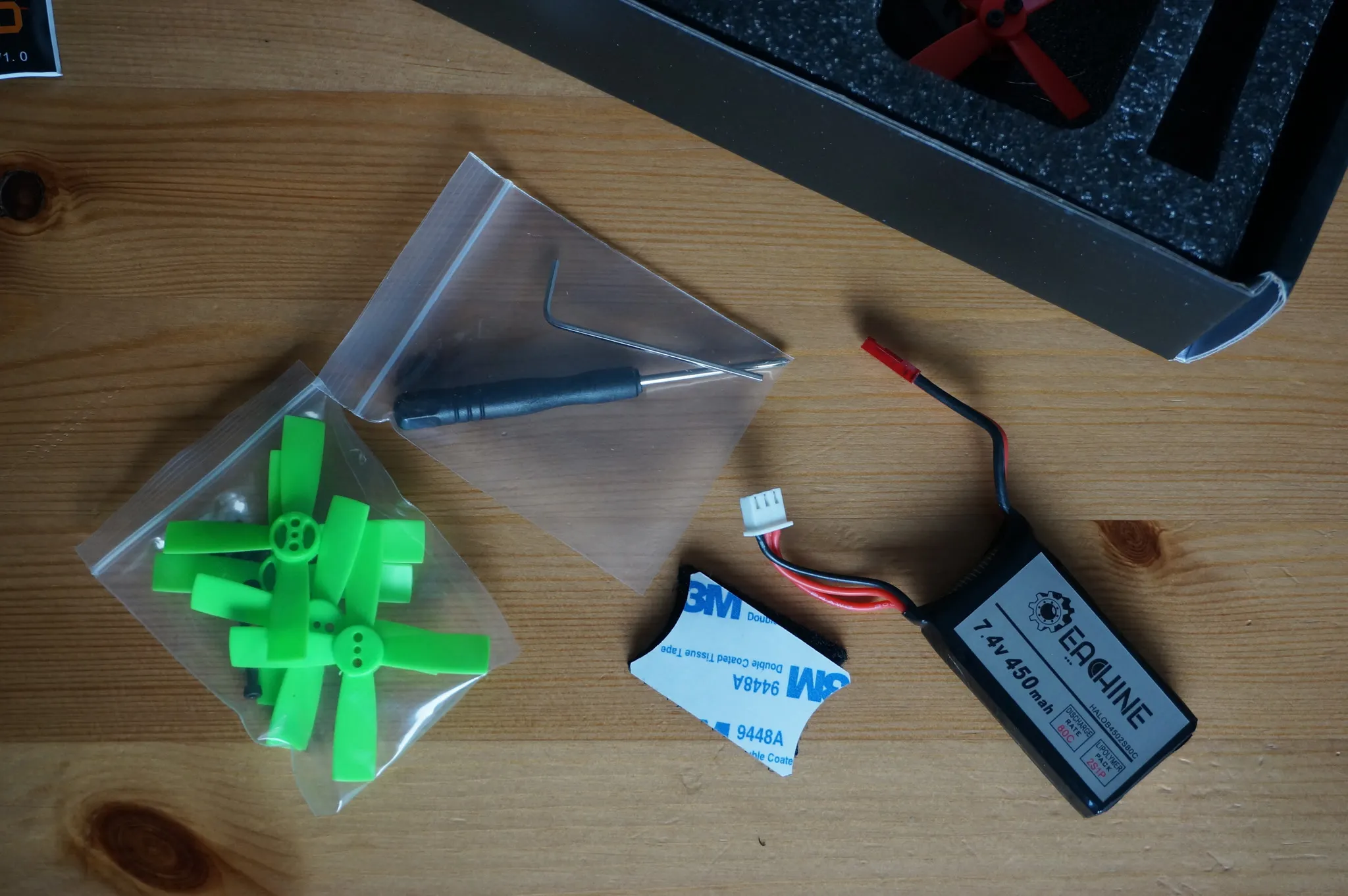 Extra props, some rubber bands and velcro, a screwdriver, and the battery.