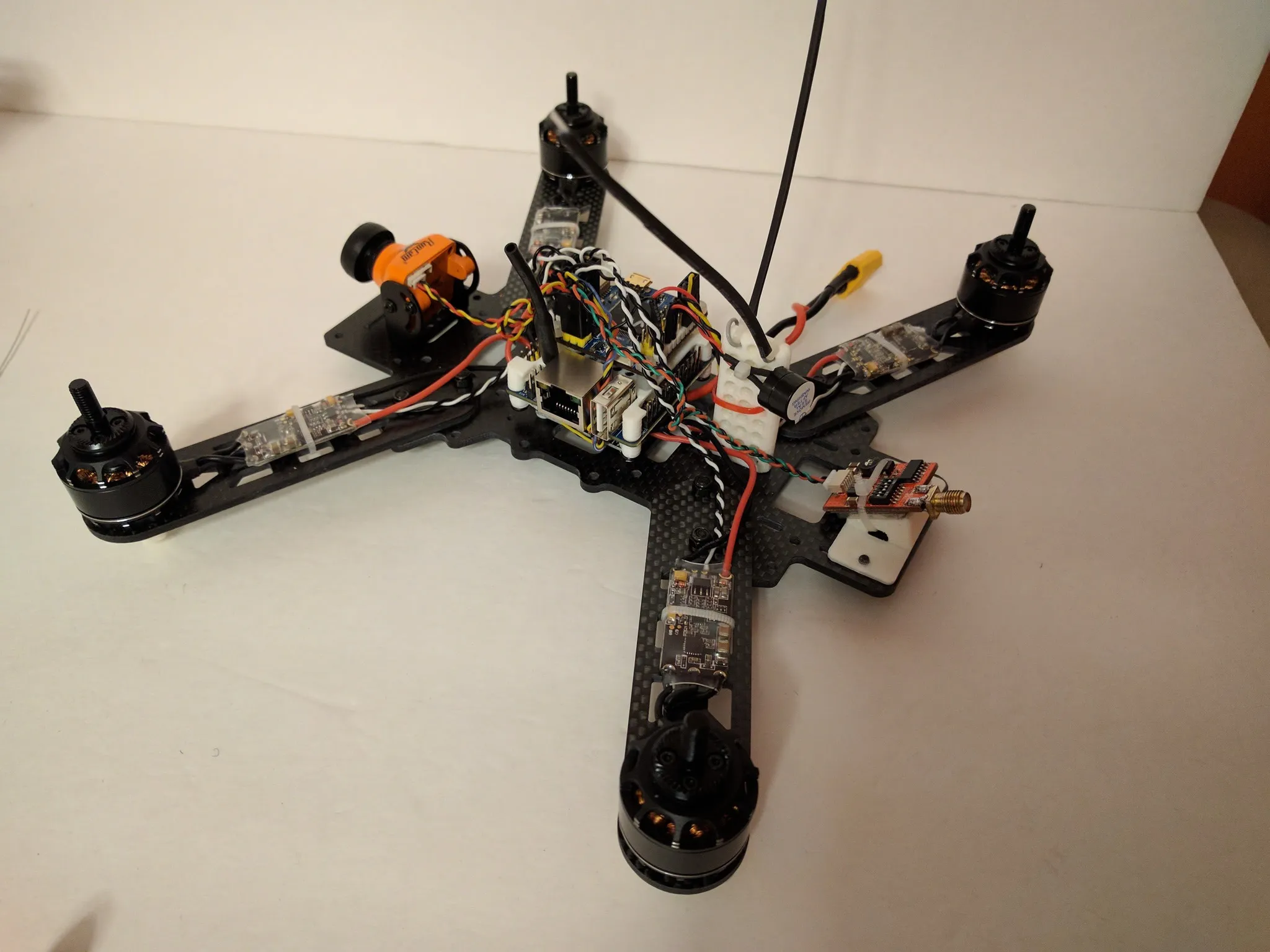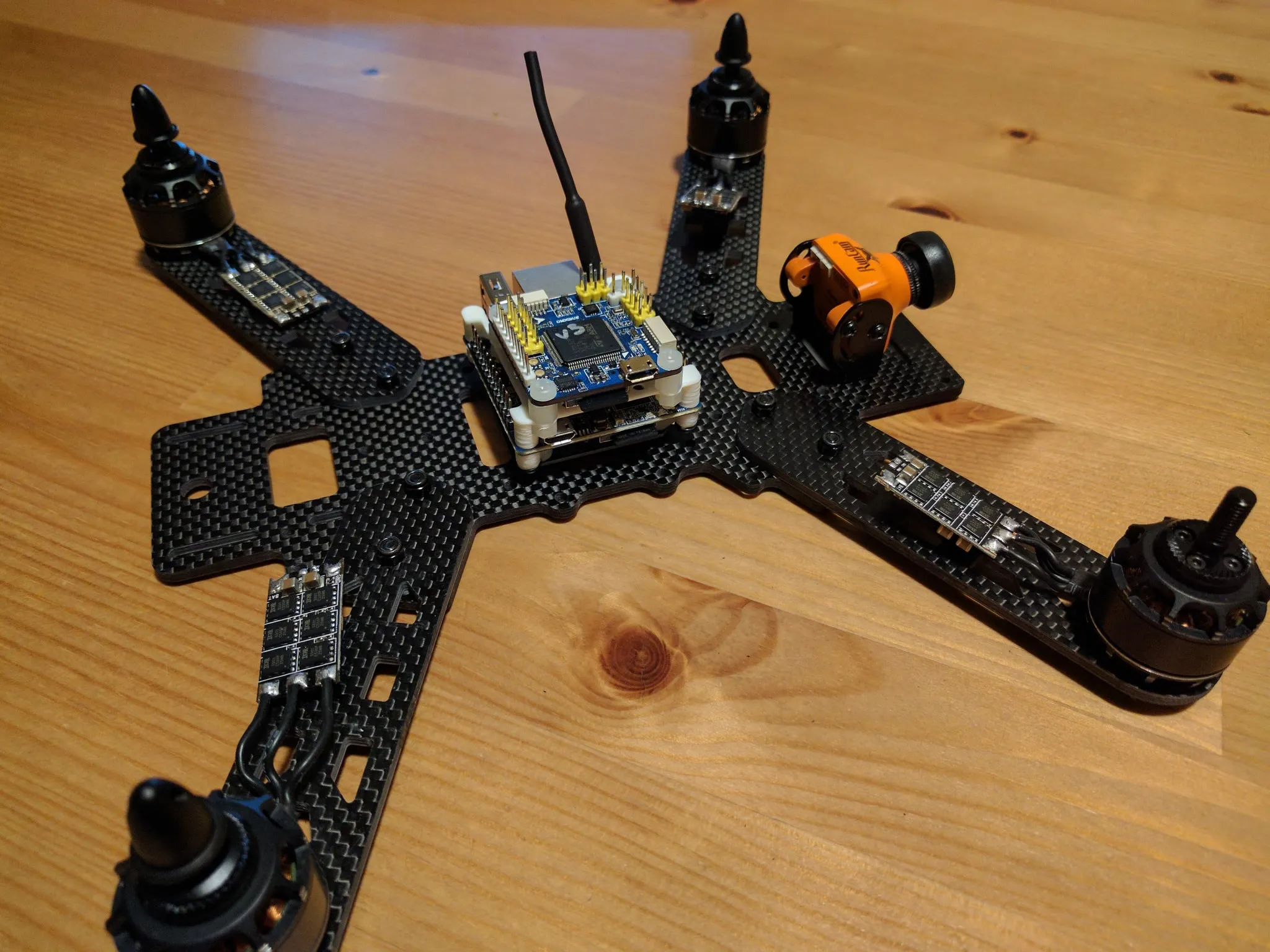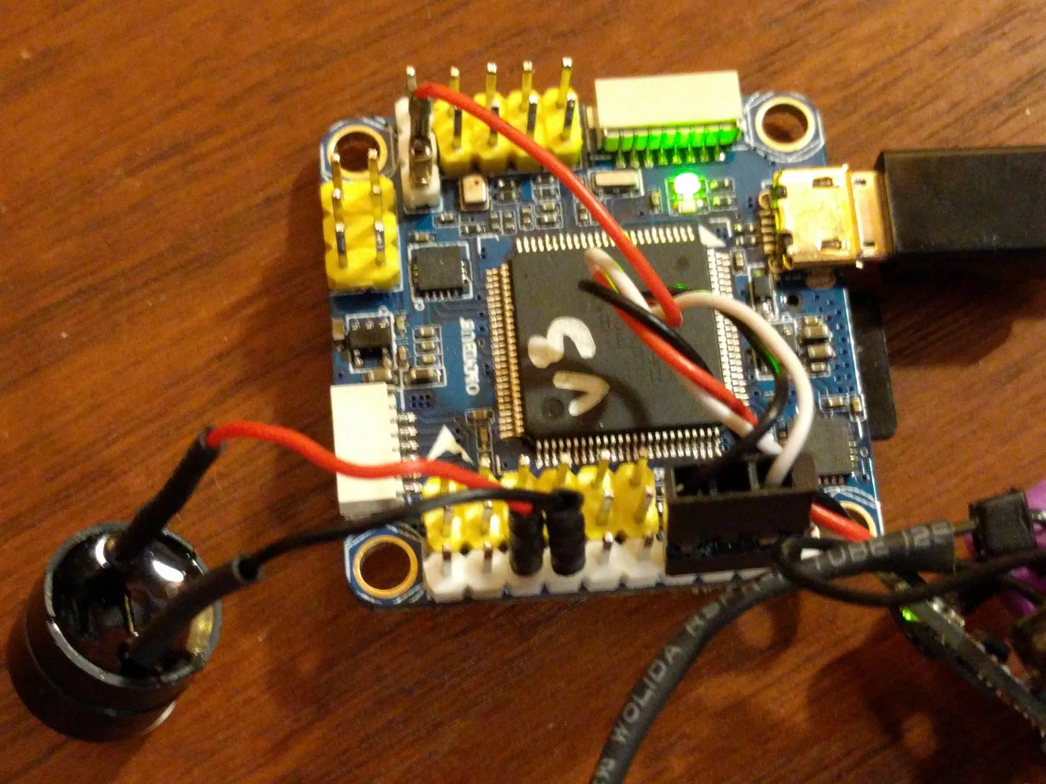 It uses Airbot BumpBee ESCs and motors. You might have noticed the single-board computer underneath the OmnibusF7. This is not used at the moment but will eventually provide onboard, multicore, application-layer processing power :)