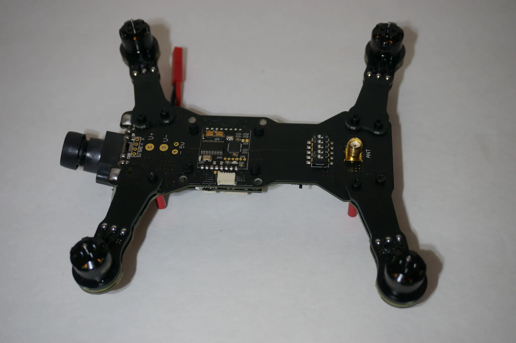 DIP switches to change the video transmitter channels are on the top, which is convenient. There is a standard micro USB port on the other side of the flight controller.