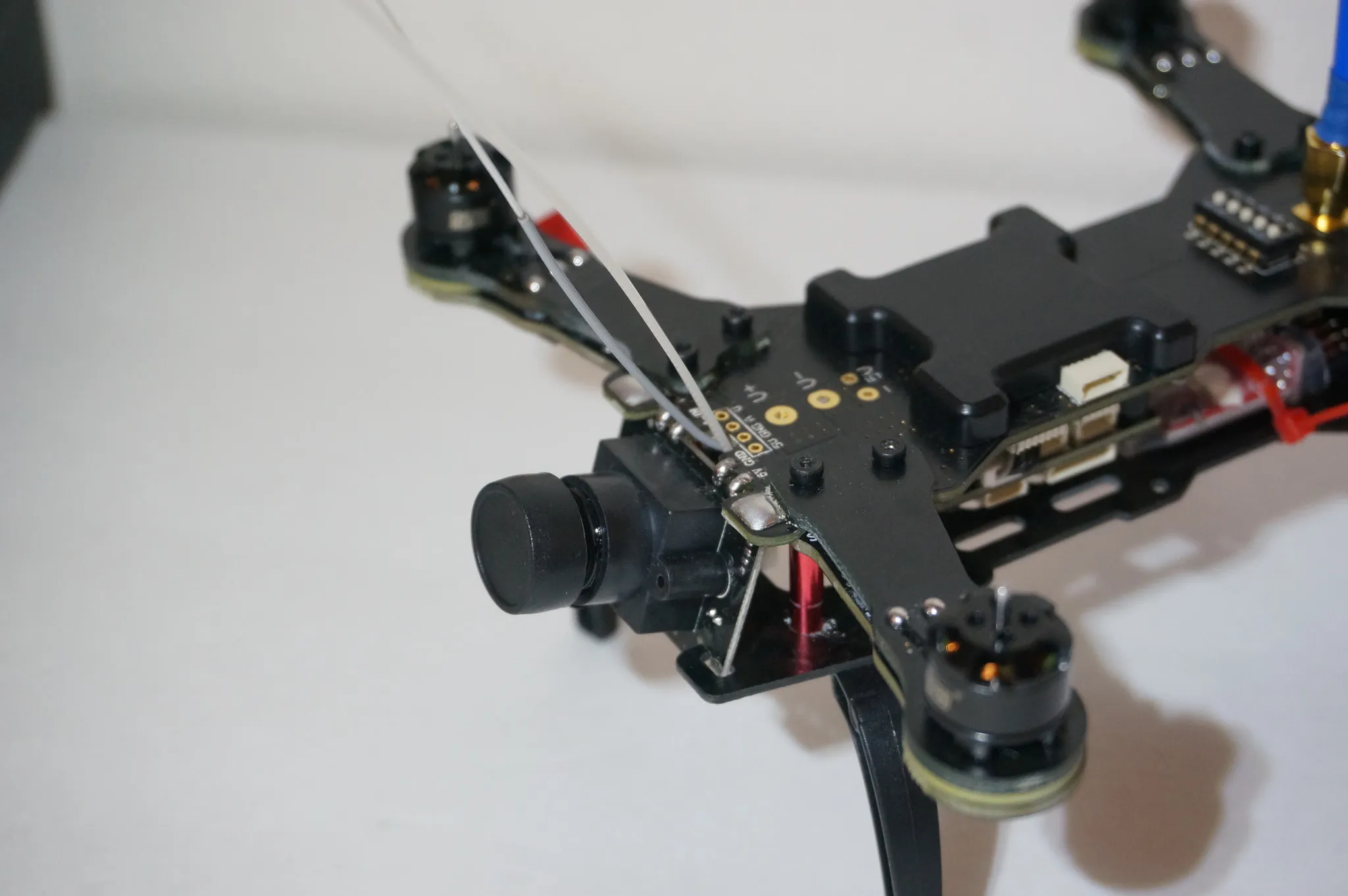 The smaller motors mean that we can’t run the standard super-durable DYS Props and SMA adaptor on the top is likely to be pushed down into the frame in a moderate crash. I talk about this more in the strength section.