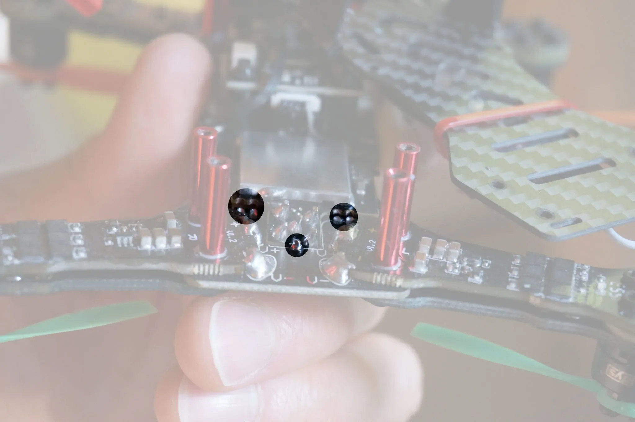 On further inspection, I found that the failure points were these two solder points that hold the VTX to the frame. The third, middle solder point did not fail. I suggest you add some extra solder to these solder points when installing the landing gear and you shouldn’t have any trouble: