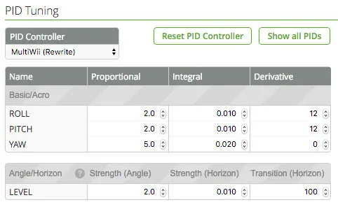 Here are the default PIDs, looks like it’s set to use the REWRITE pid controller by default. Since the data flash has some data, it makes me think they flight-tested this before sending it, cool!