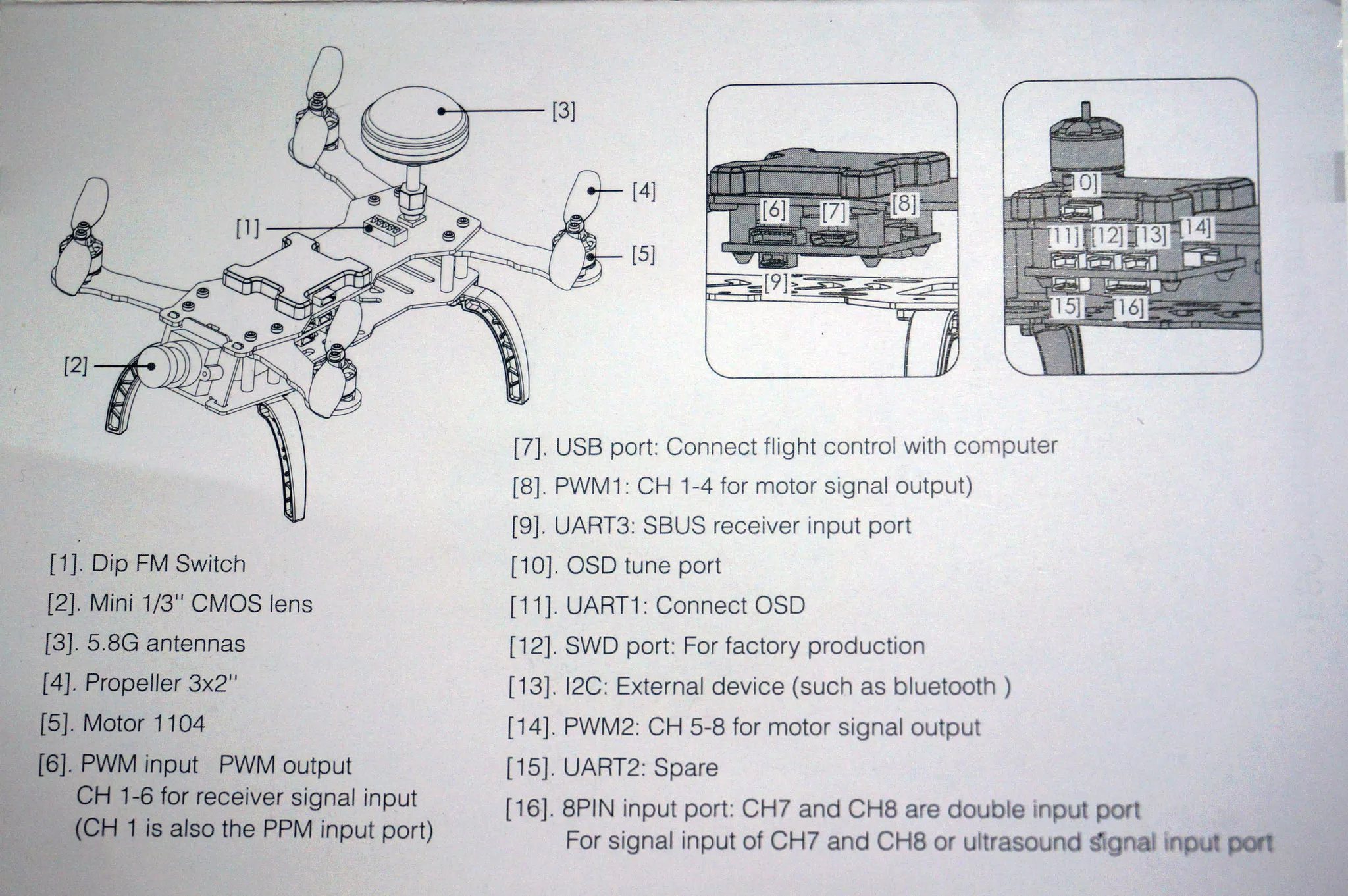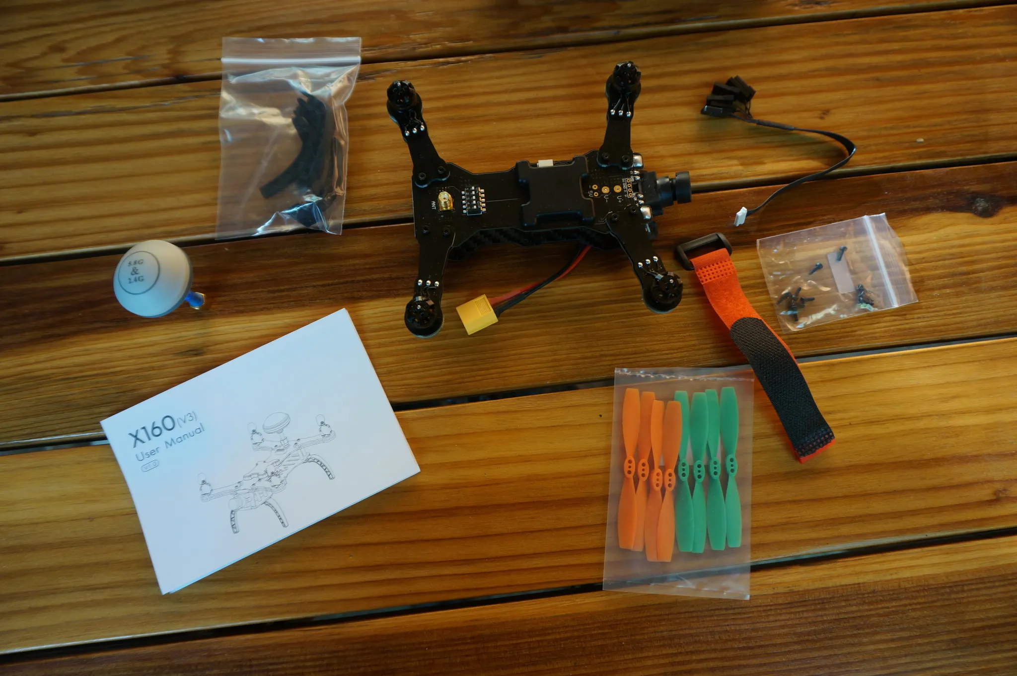 It comes with an antenna, landing gear, battery strap, PWM receiver breakout cable, some extra screws 8 3030 props and user manual.
