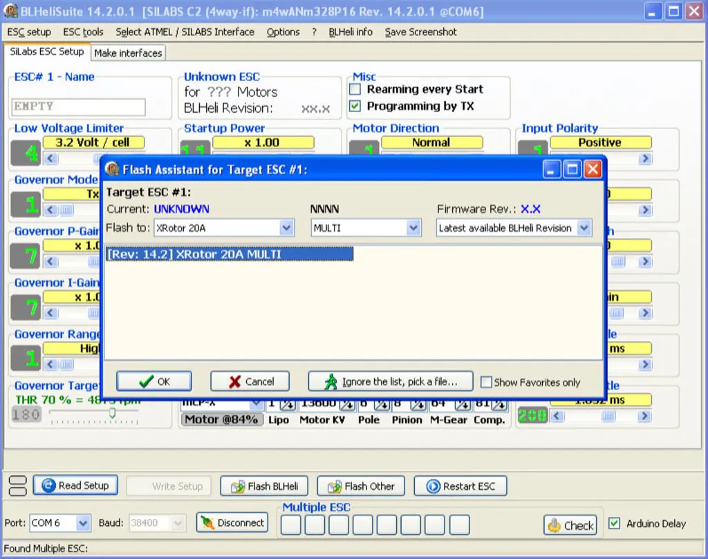 Pick the version of BlHeli that corresponds to your ESC, in this example we’re using the XROTOR 20A MULTI code. There are 3 versions of BlHeli. You’ll always want multi, unless you’re doing something weird like flying a helicopter (not a multi-copter).