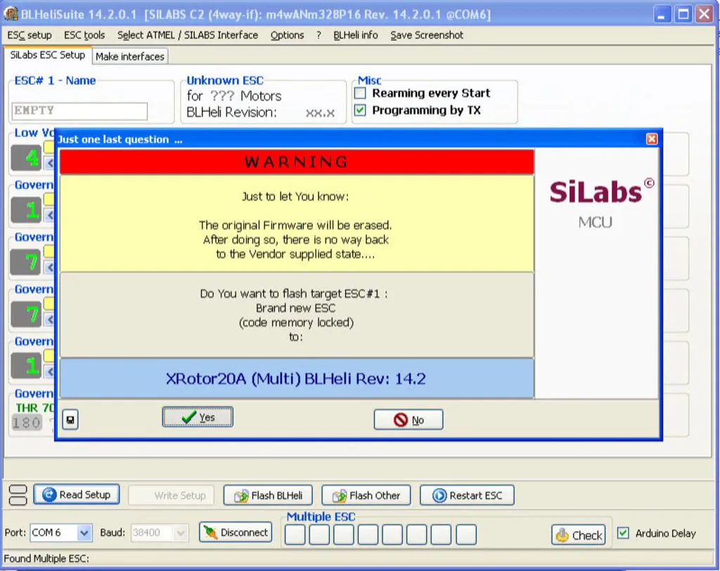 Confirm that you want to flash BlHeli, erasing the original firmware.
