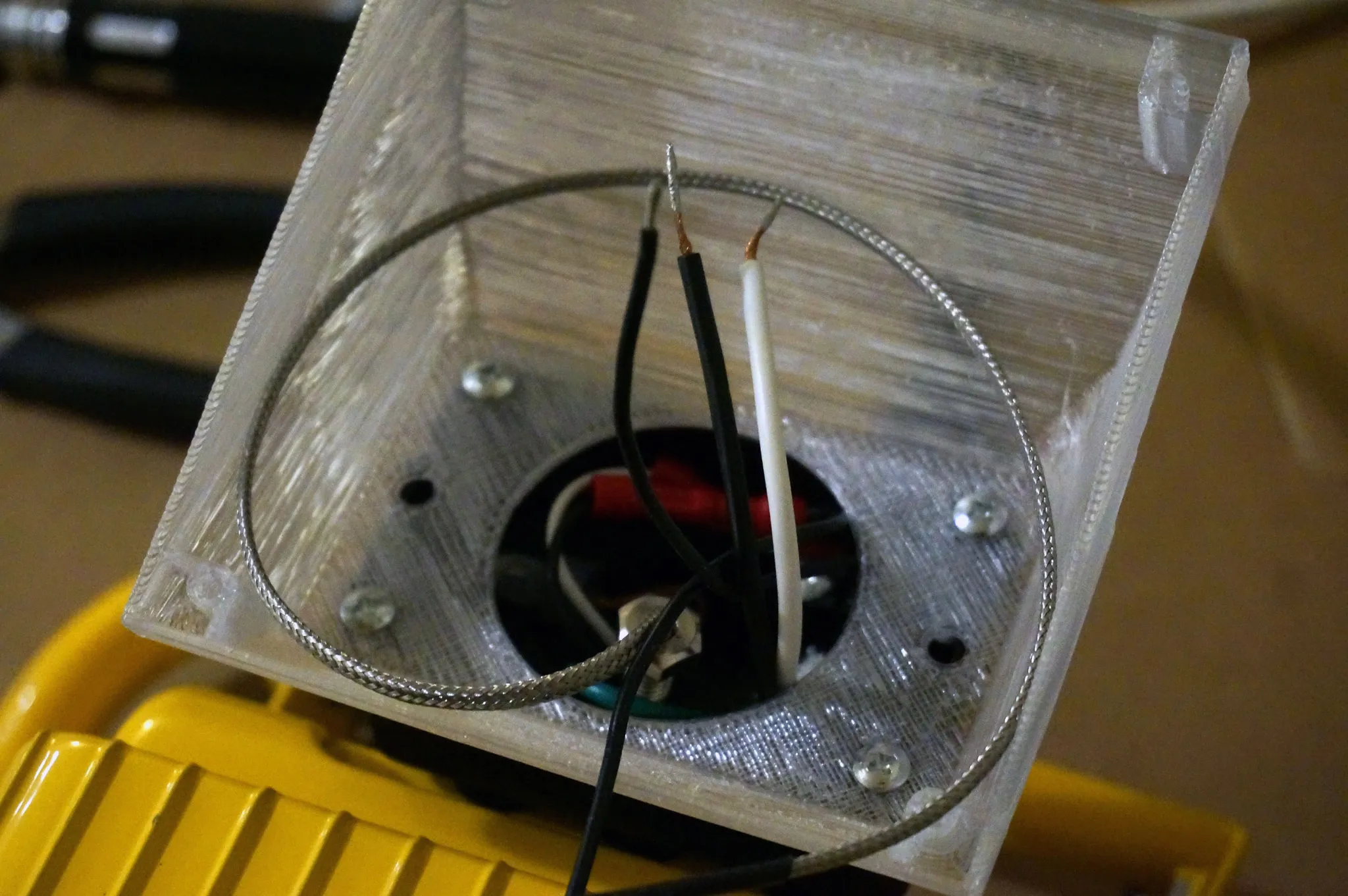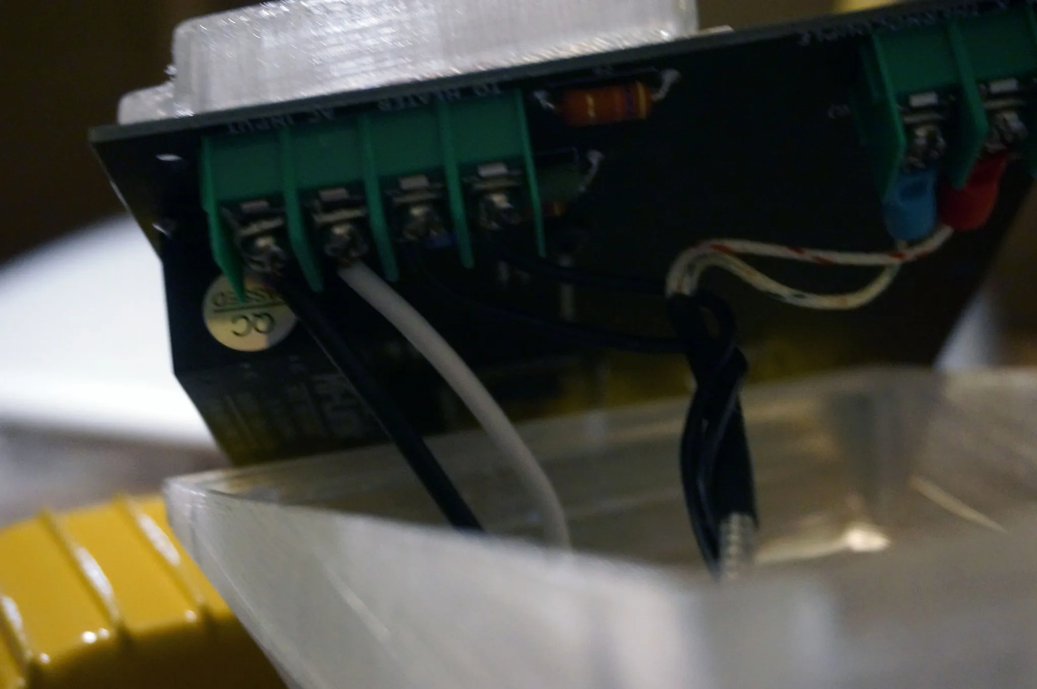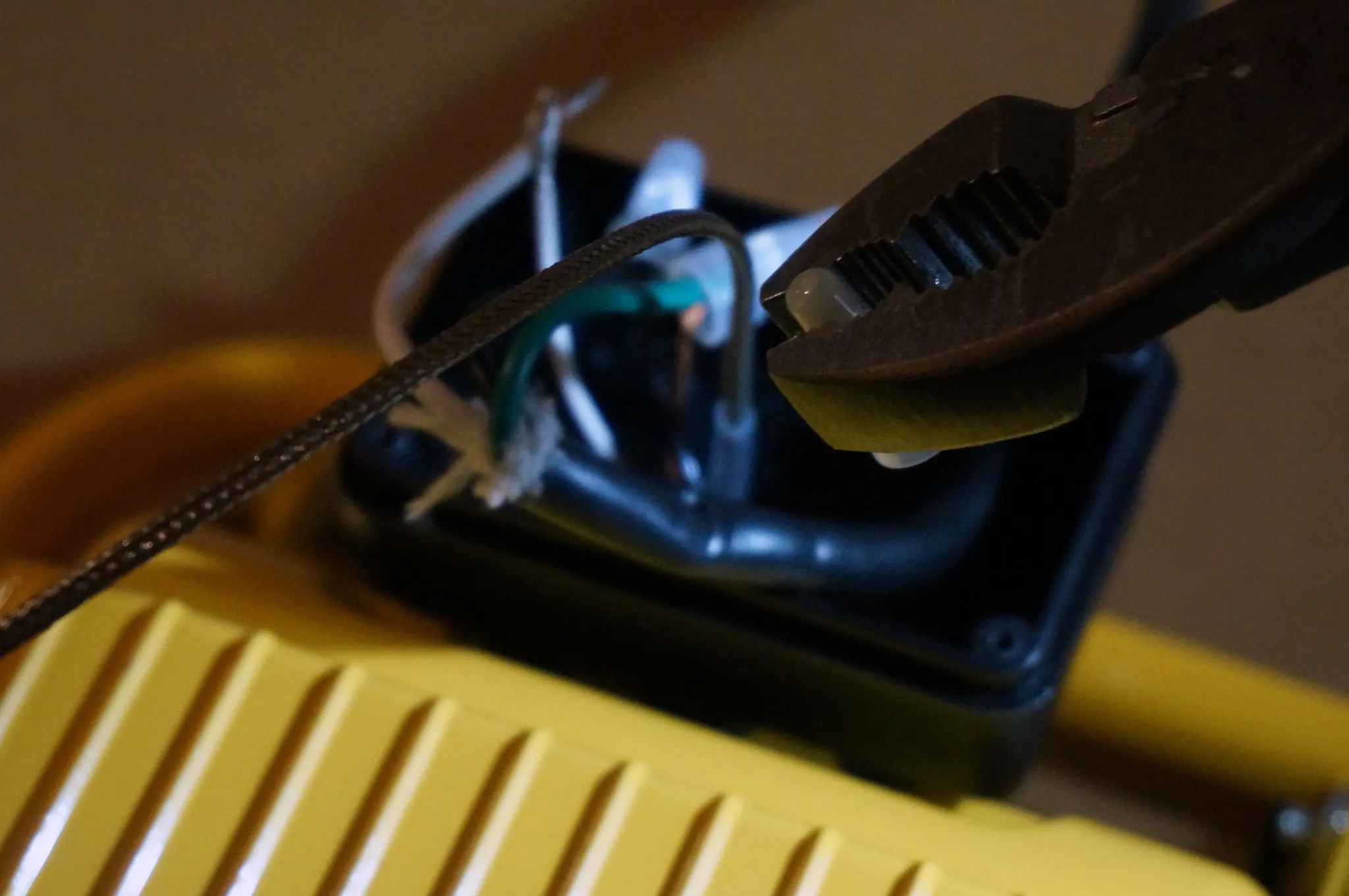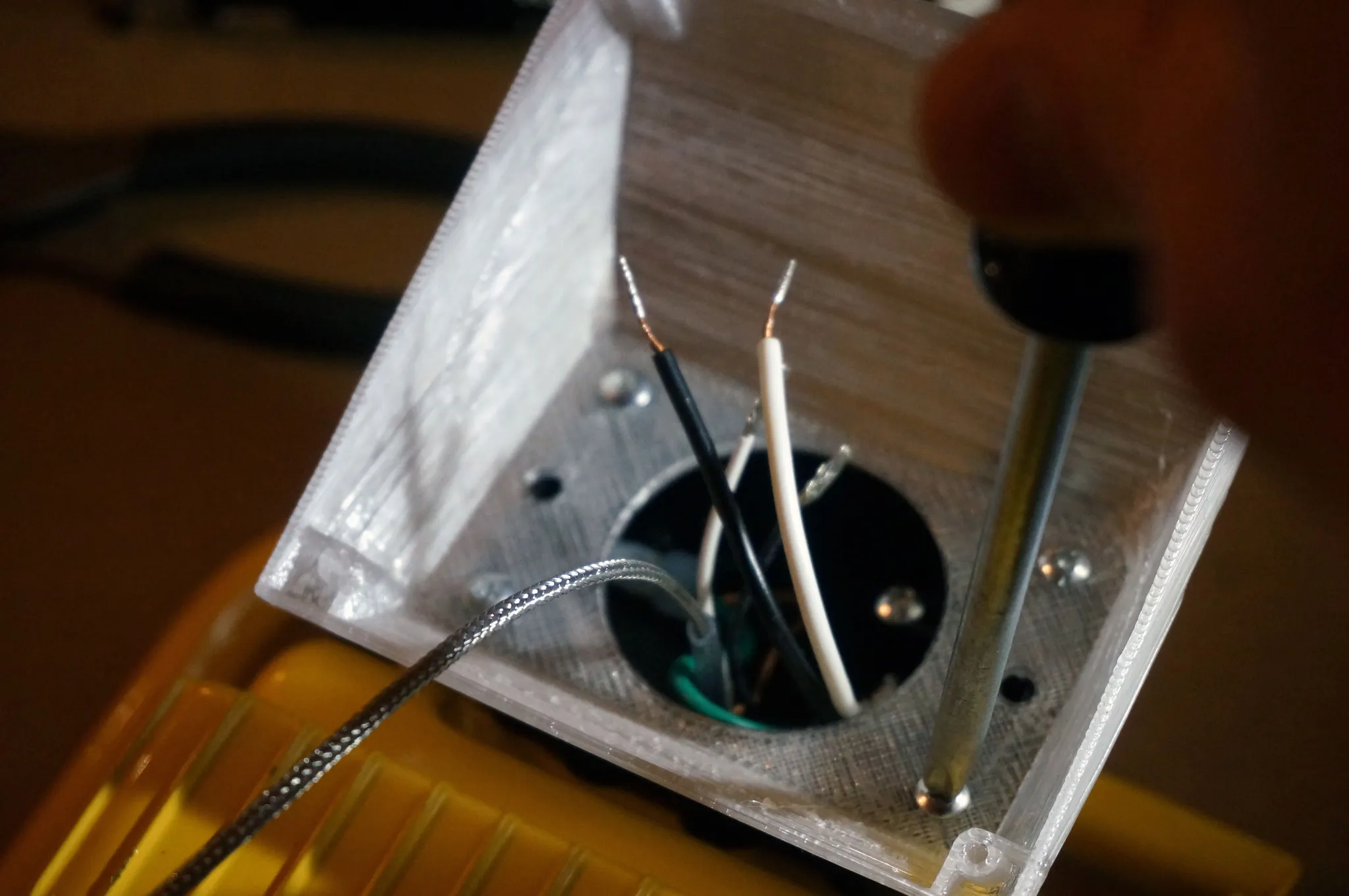 Now all the wires except the bare copper ground wire should be free, so grab your 3D printed mount, set it on the black plastic wire box, and pull the extension cord back a bit until the wires reach into the corner of the 3D printed mount. Route the ground out of the way. If the power leads don’t reach, use a knife to cut back a bit of the power cord casing.