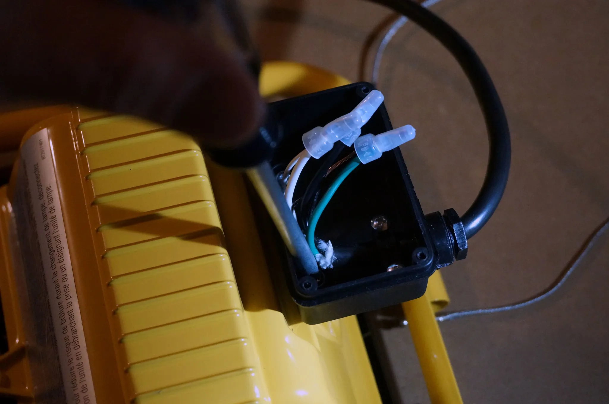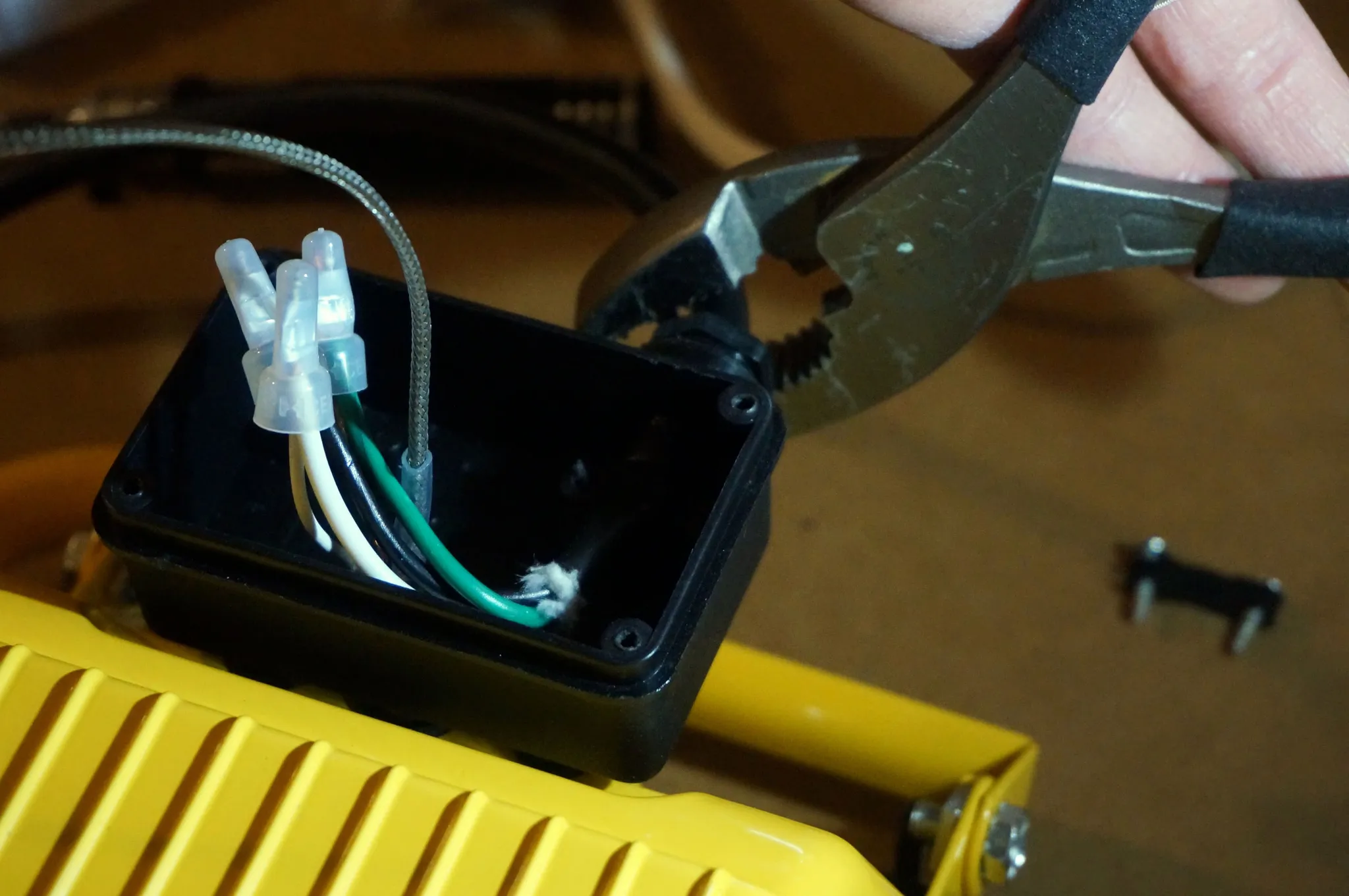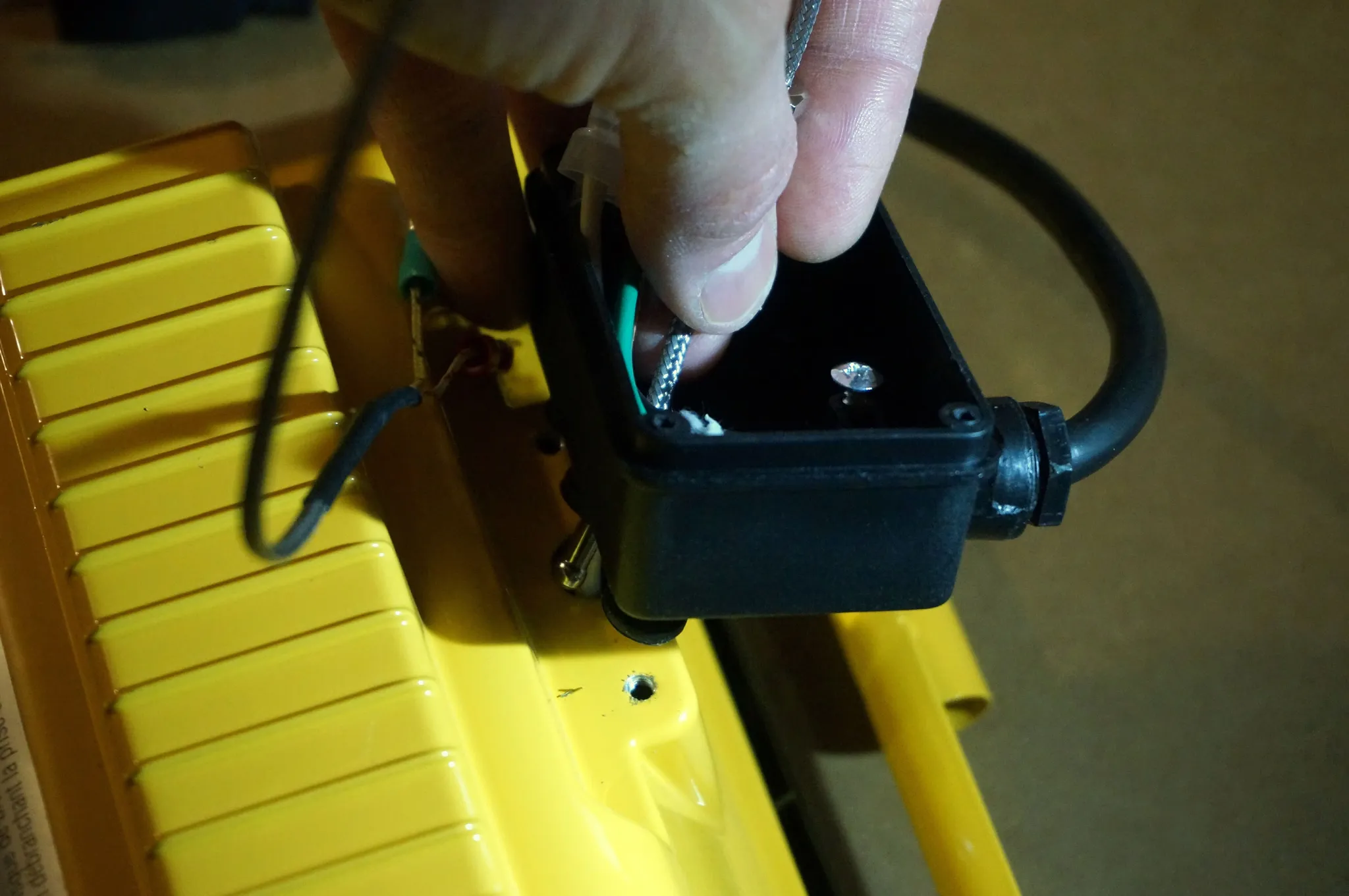 Now all the wires except the bare copper ground wire should be free, so grab your 3D printed mount, set it on the black plastic wire box, and pull the extension cord back a bit until the wires reach into the corner of the 3D printed mount. Route the ground out of the way. If the power leads don’t reach, use a knife to cut back a bit of the power cord casing.