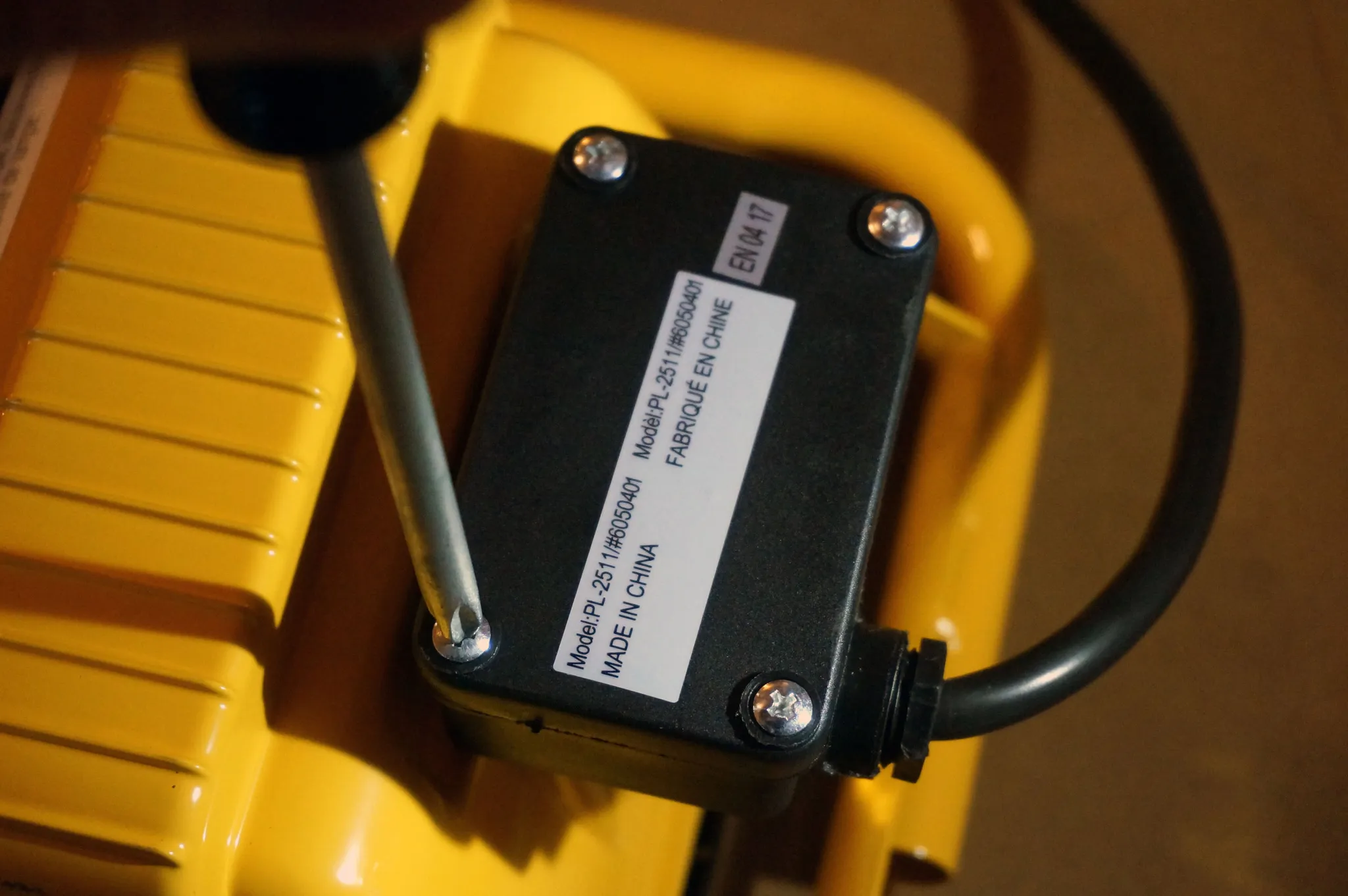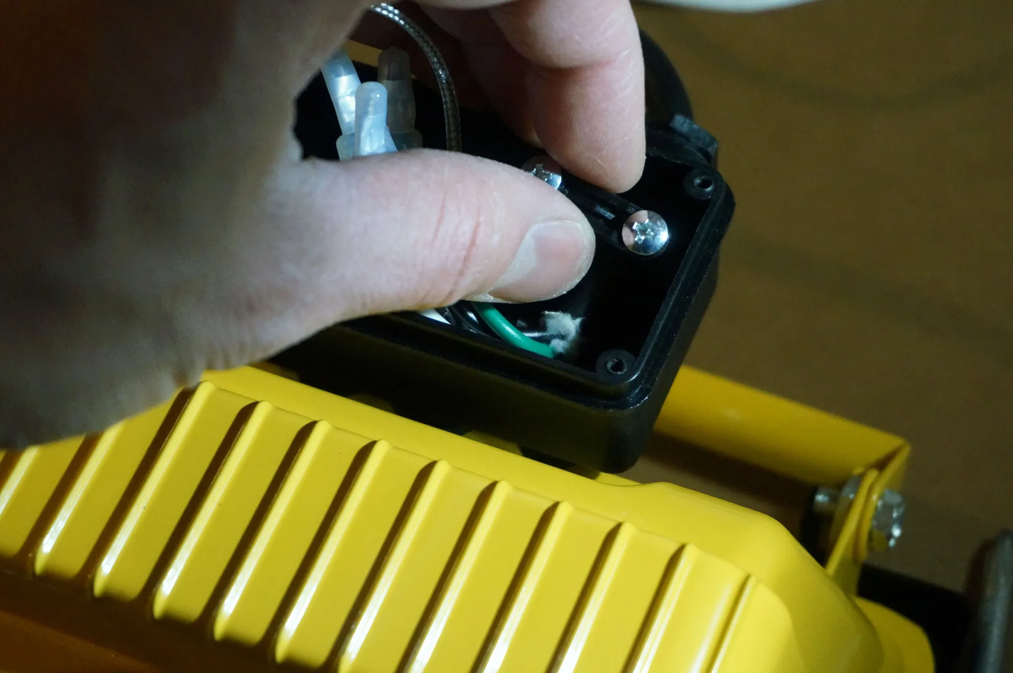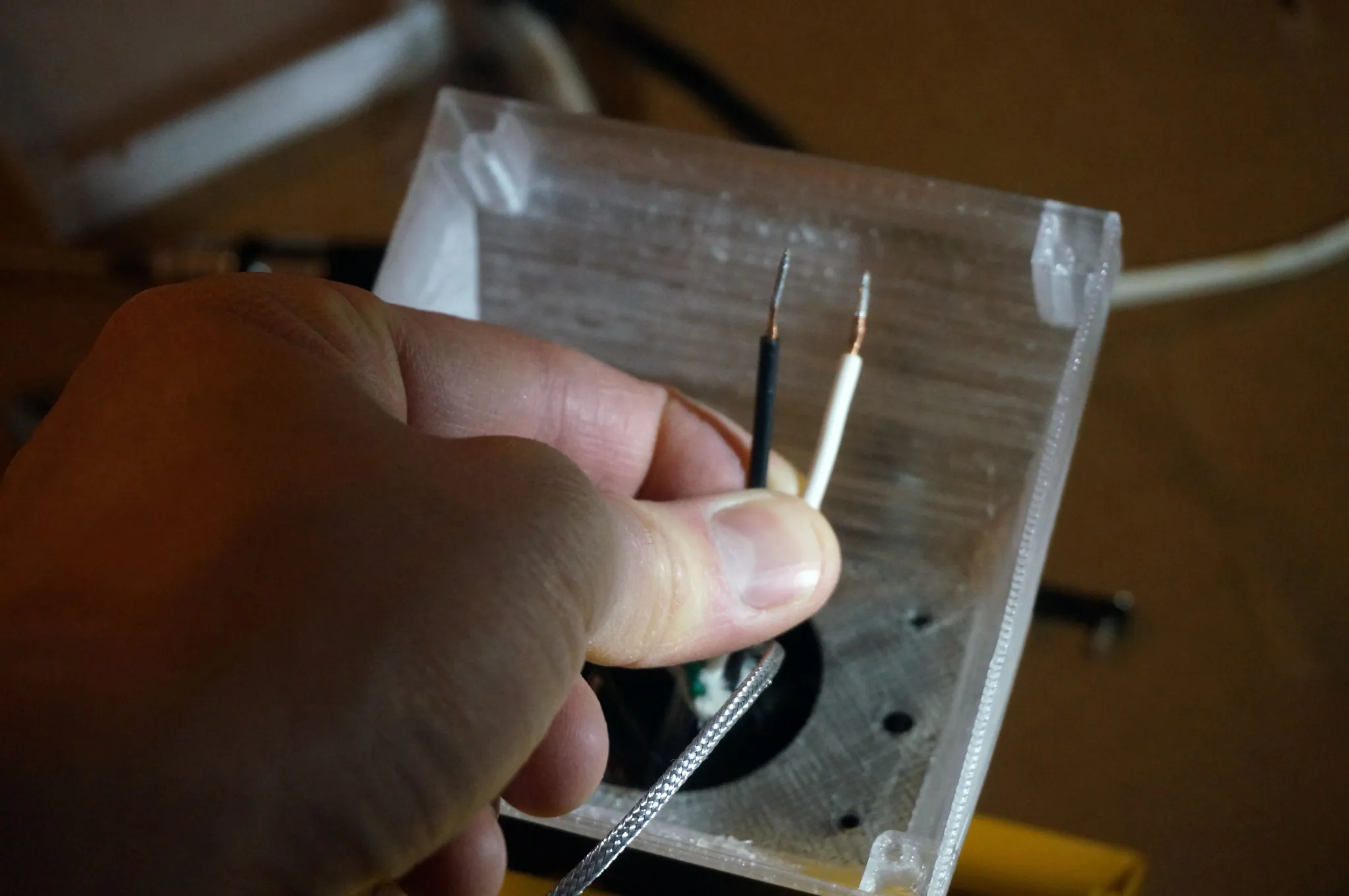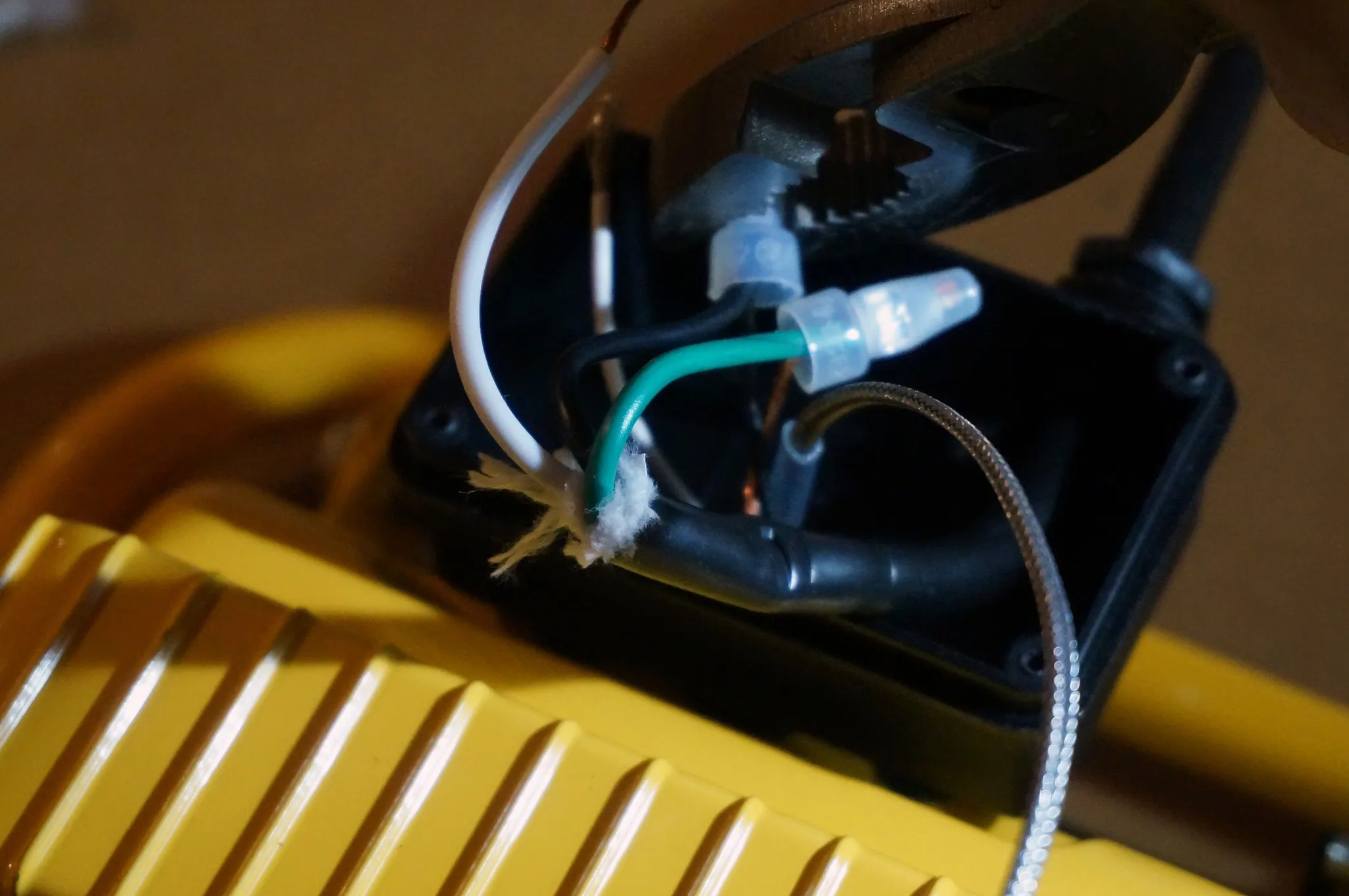 Now all the wires except the bare copper ground wire should be free, so grab your 3D printed mount, set it on the black plastic wire box, and pull the extension cord back a bit until the wires reach into the corner of the 3D printed mount. Route the ground out of the way. If the power leads don’t reach, use a knife to cut back a bit of the power cord casing.