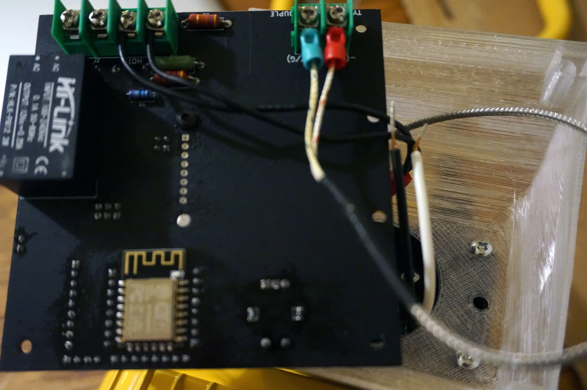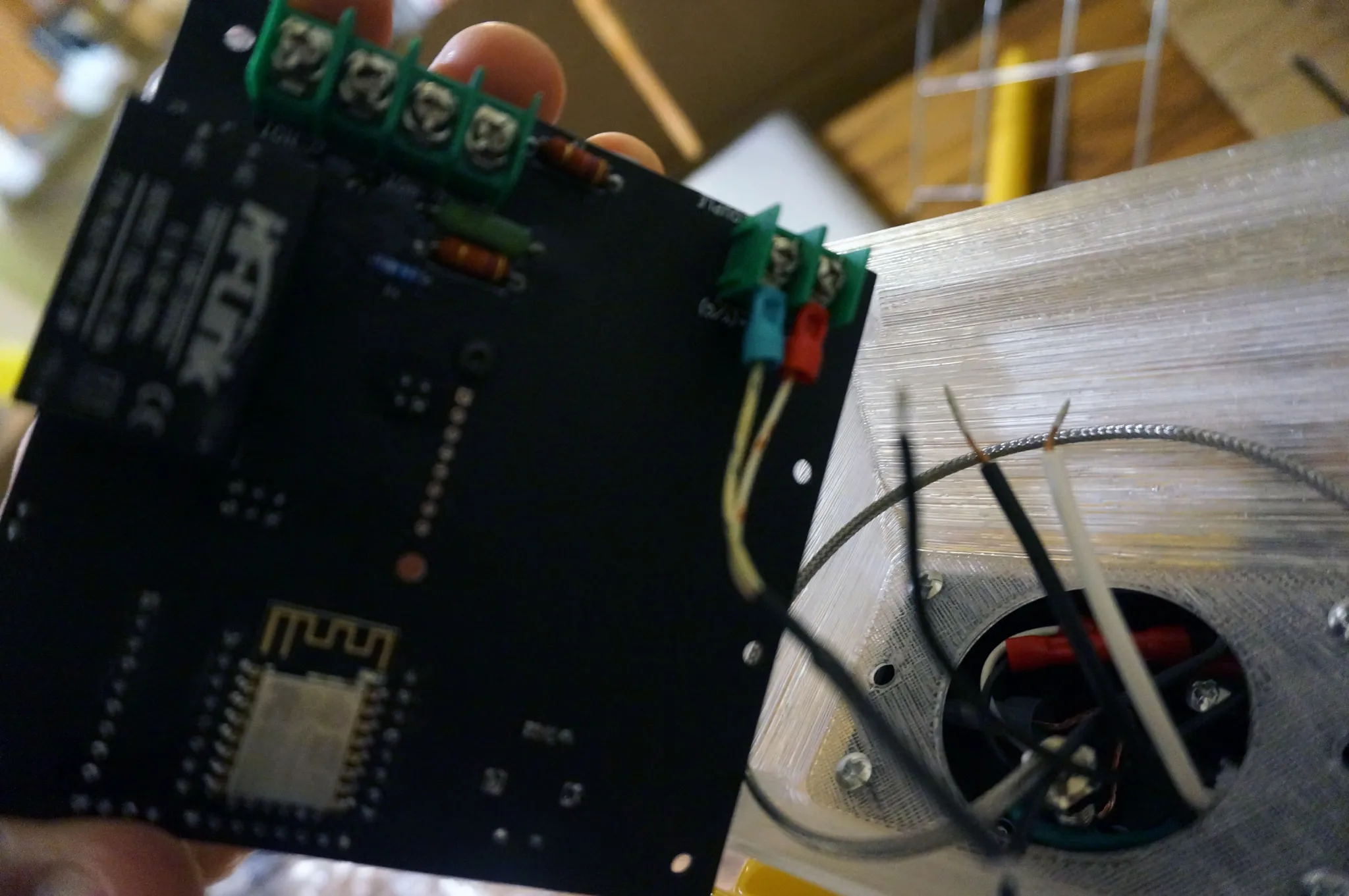 Now we can wire up the board. Install the thermocouple. The board is labeled correctly, but I noticed some k-type thermocouples I ordered had the colors on the leads switched. If the temp goes down when it should be going up, the leads are on the wrong way. It doesn’t hurt the sensor to just try one way, and if it’s backwards, switch it.