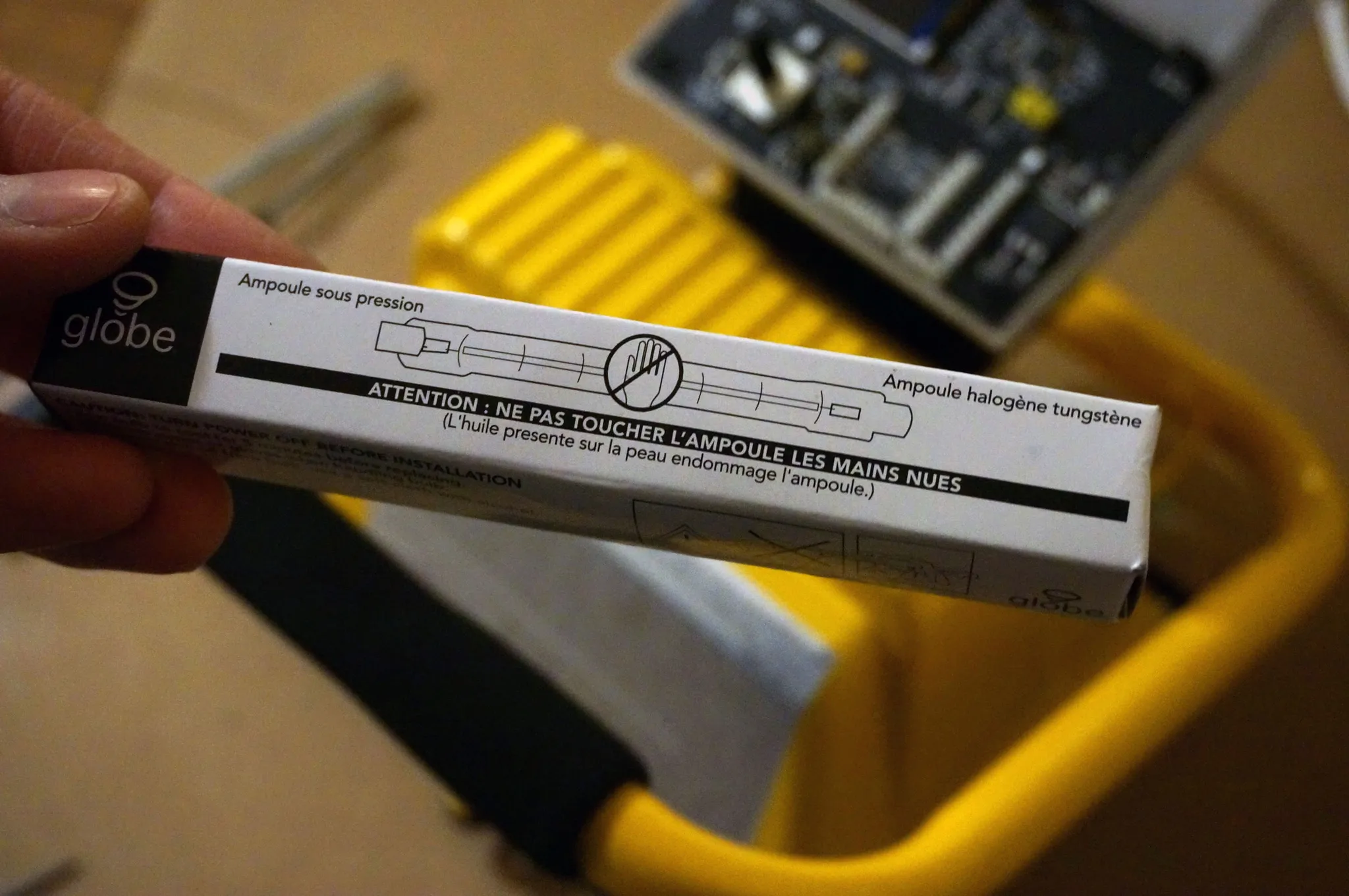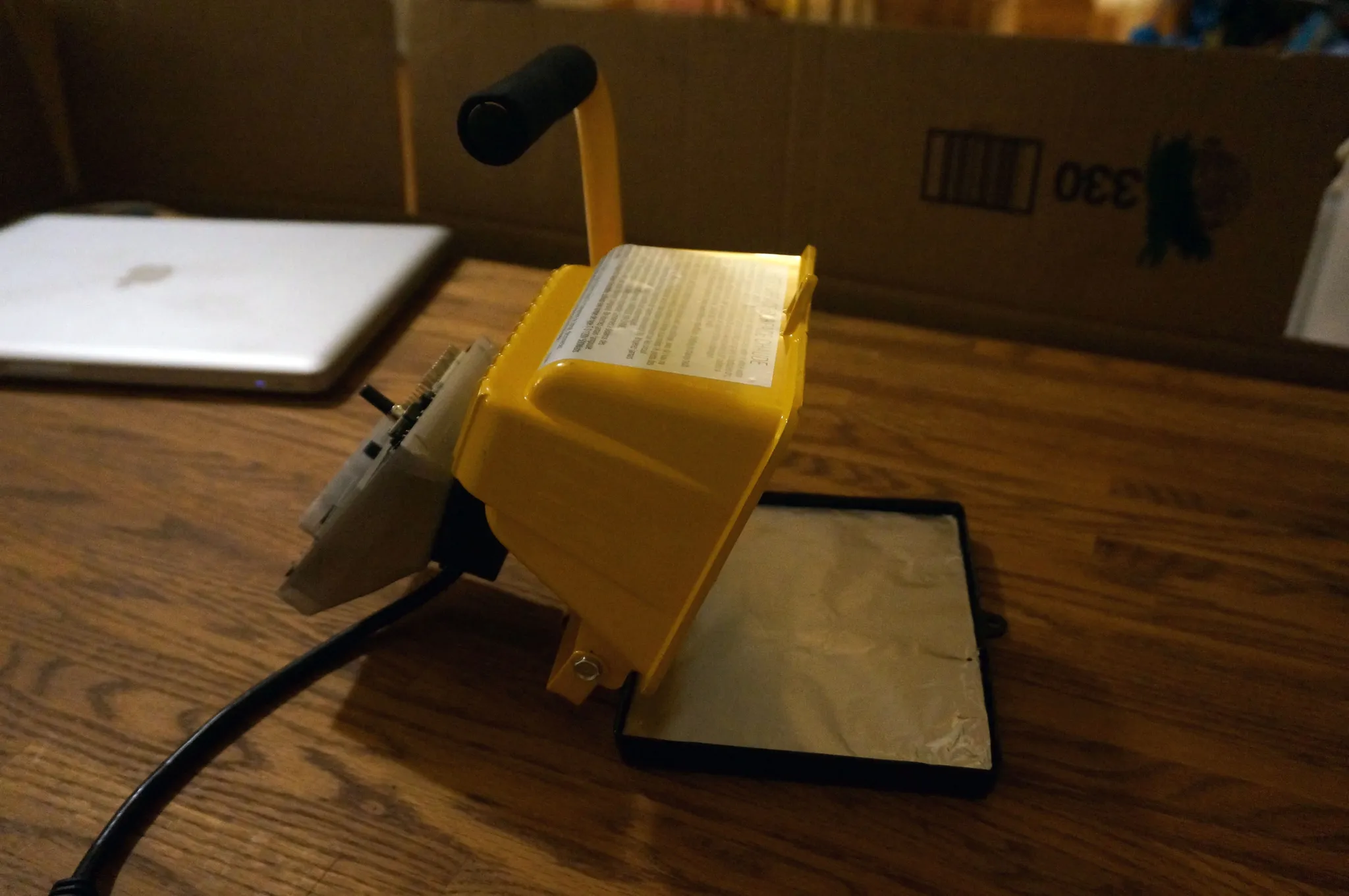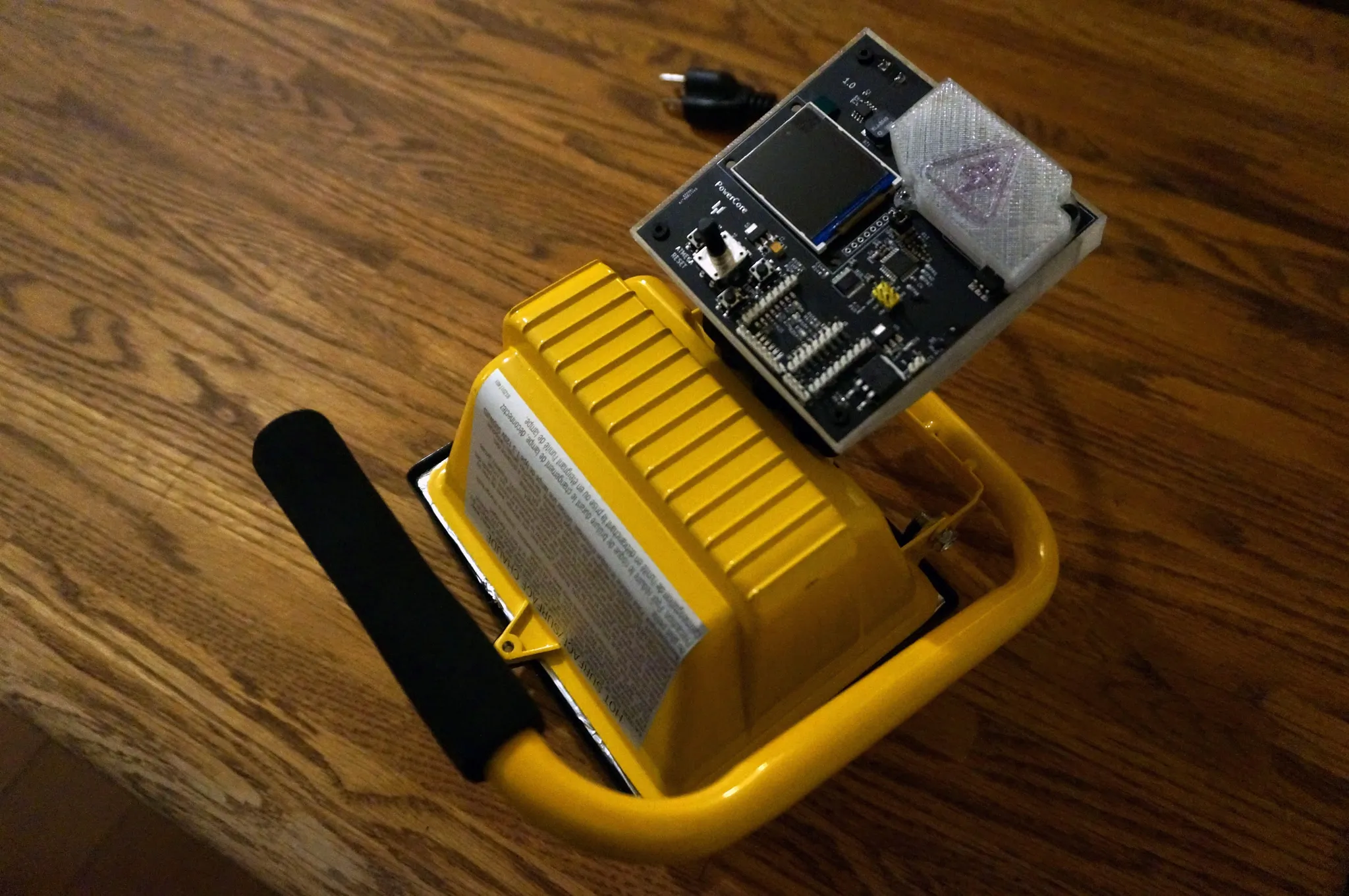 On top of this halogen lamp is a 3D printed box with the control unit that you can order when the Indiegogo launches or print yourself from the designs on Thingiverse.