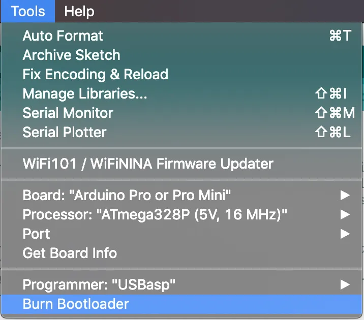 Download and open the Arduino Software package and open the Tools menu. Choose your Board: Arduino Pro or Pro Mini, Processor: ATmega328p (5V, 16MHz), then click Burn Bootloader.