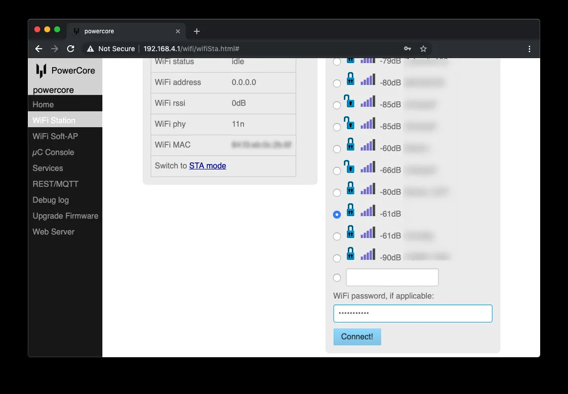 Under WiFi Station, click Switch to STA+AP mode, pick your WiFi network on the right, and click Connect!.