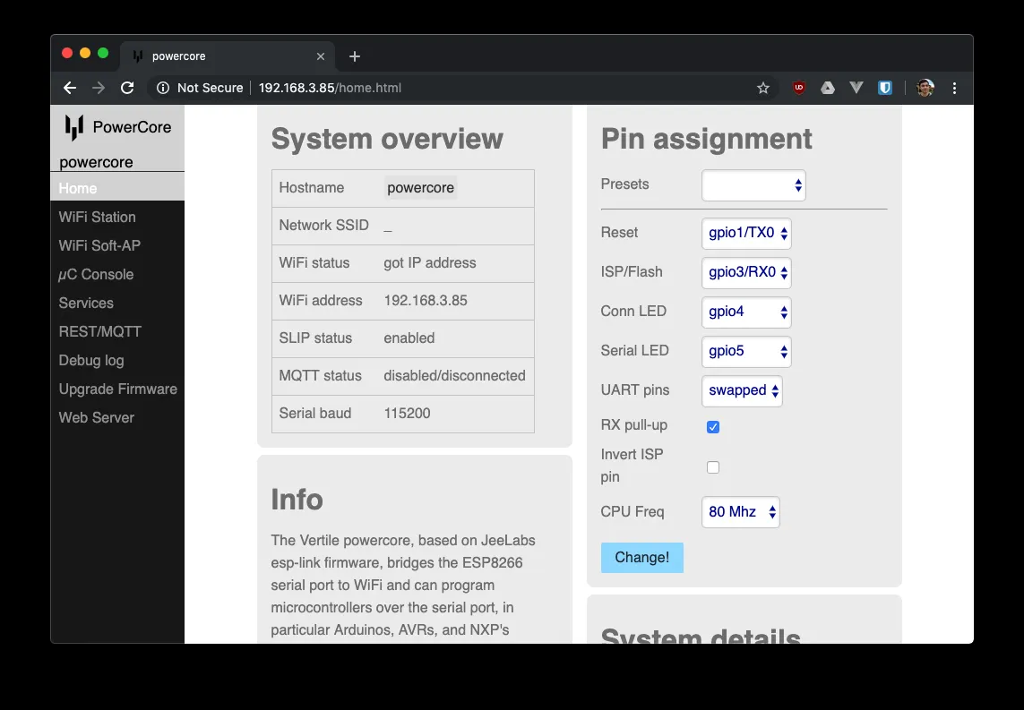Under Pin Assignments, pick esp-12 swap, then switch Conn LED to GPIO4 and Serial LED to GPIO5 and hit Change!.