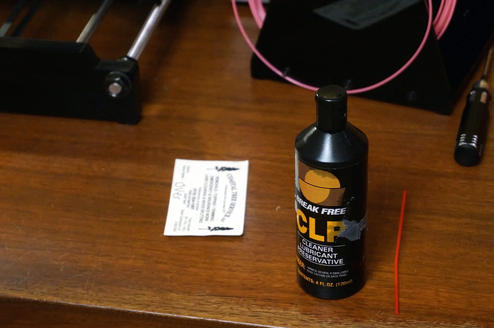 The first thing to calibrate is the belt tension. We want it as tight as possible, but not too tight such that the axis binds (e.g., can’t move). Start by lubricating all the bearings and linear rods by covering them with a PTFE lubricant and moving them to every extreme. I used CLP Break-Free:
