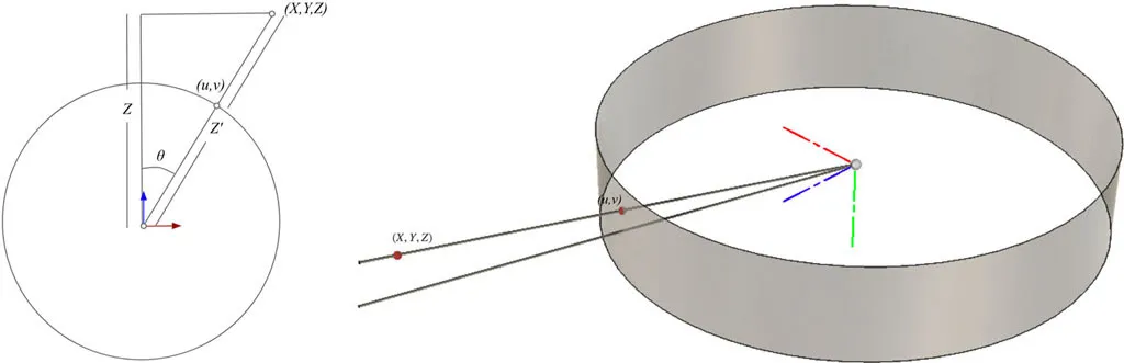 The planar projective pinhole camera model is applied to a cylinder as follows.