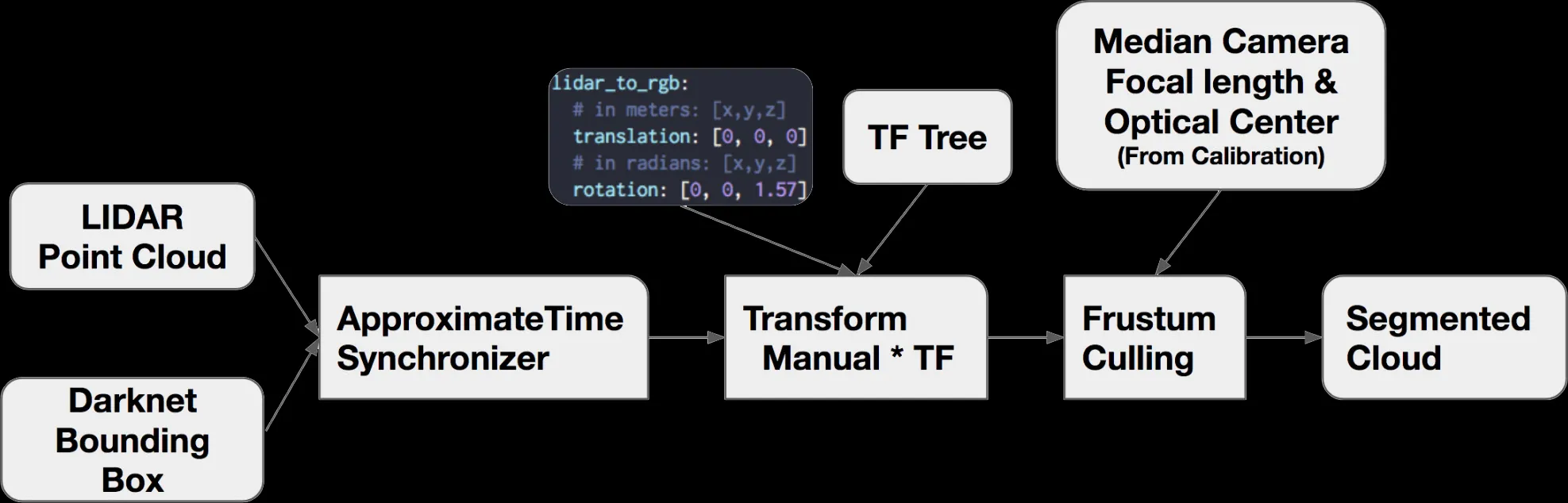 With this information, along with the 2D tracking information, a.k.a. “Darknet Bounding Box” in the diagram, frustum culling is used to segment the point cloud. I then find the center of mass on the segmented points and create the 3D track corresponding to the 2D tracking information.