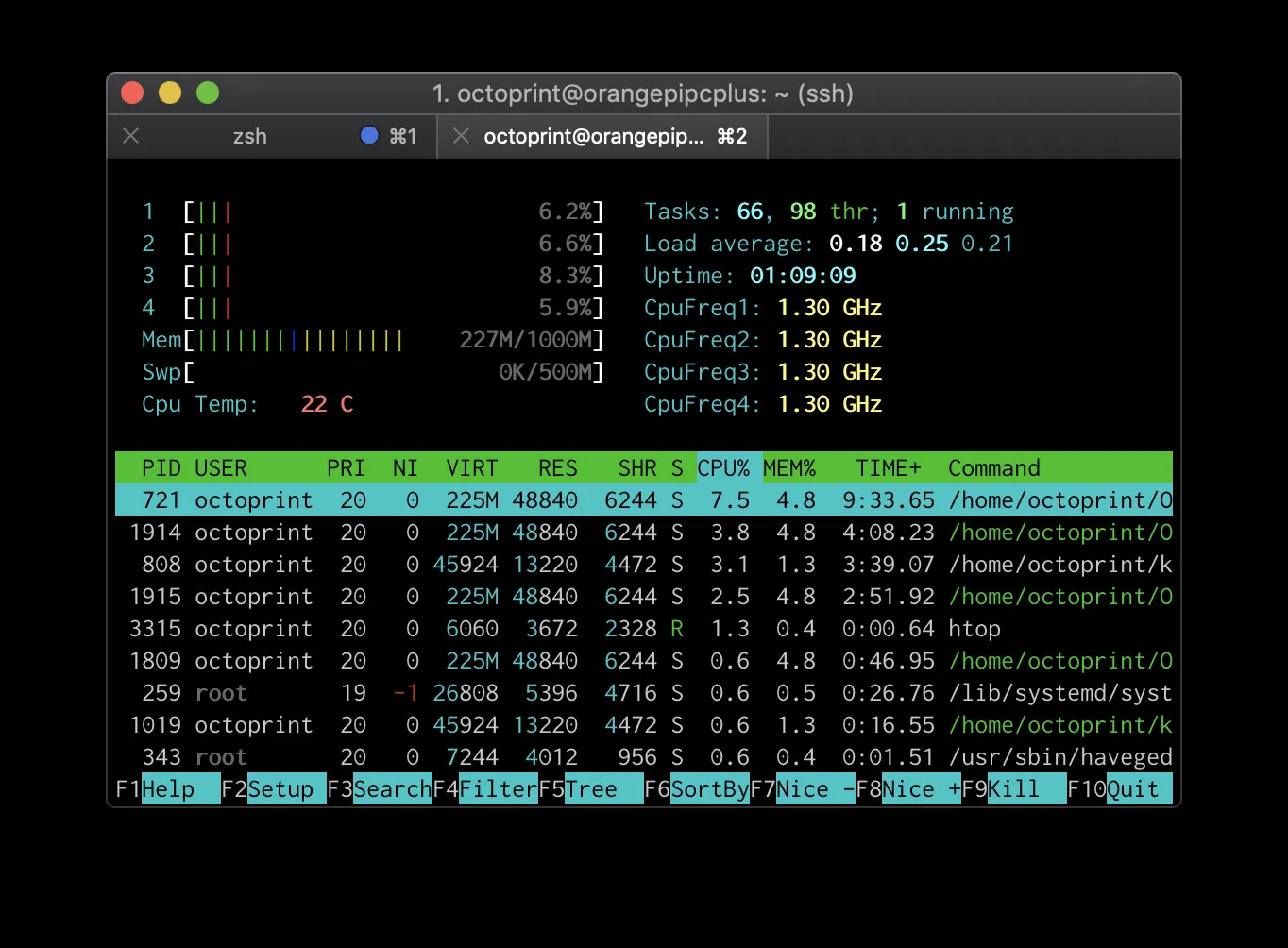 Running the whole printer stack plus Firefox, the load on the Orange Pi PC Plus seems reasonable while printing: