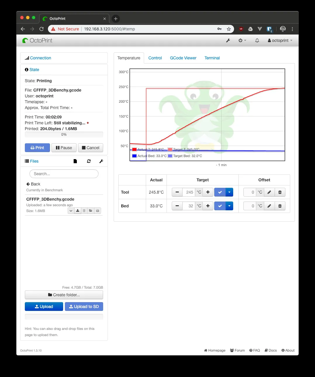 Klipper is convenient in that the printer can be controlled via a WiFi interface. No need to use an SD card to copy gcode files from the computer to the printer anymore—simply upload to OctoPrint and print away! The web UI is standard OctoPrint, or you can install the OctoPrint TouchUI plugin as shown above, depending on what you prefer.