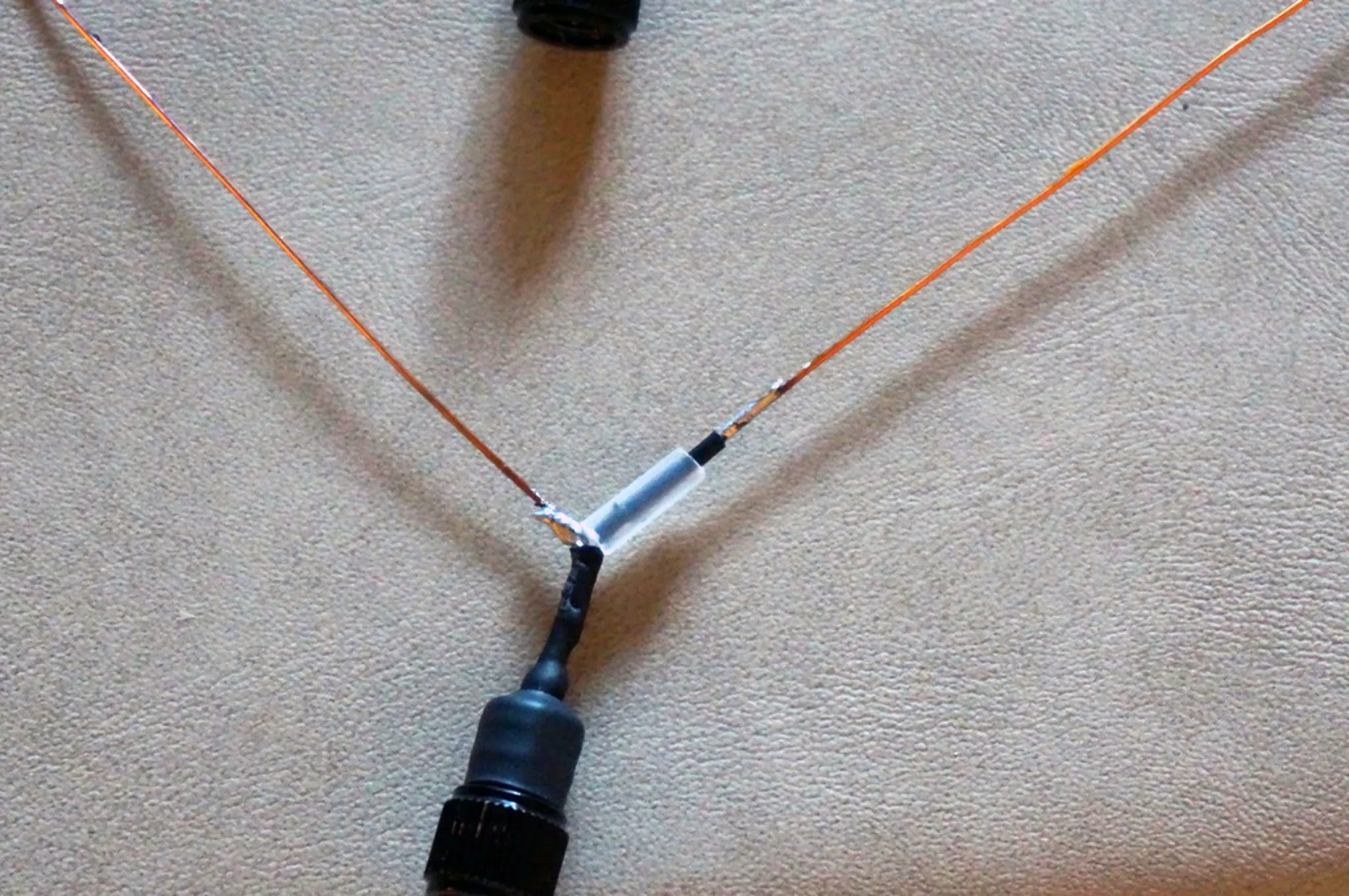 The dipole antenna uses 1/4 wavelength per wire, so each wire will be 164mm measured from where the shielding ends. Cut your wires slightly longer before attaching, then trim them to length. I cut mine at 18cm.