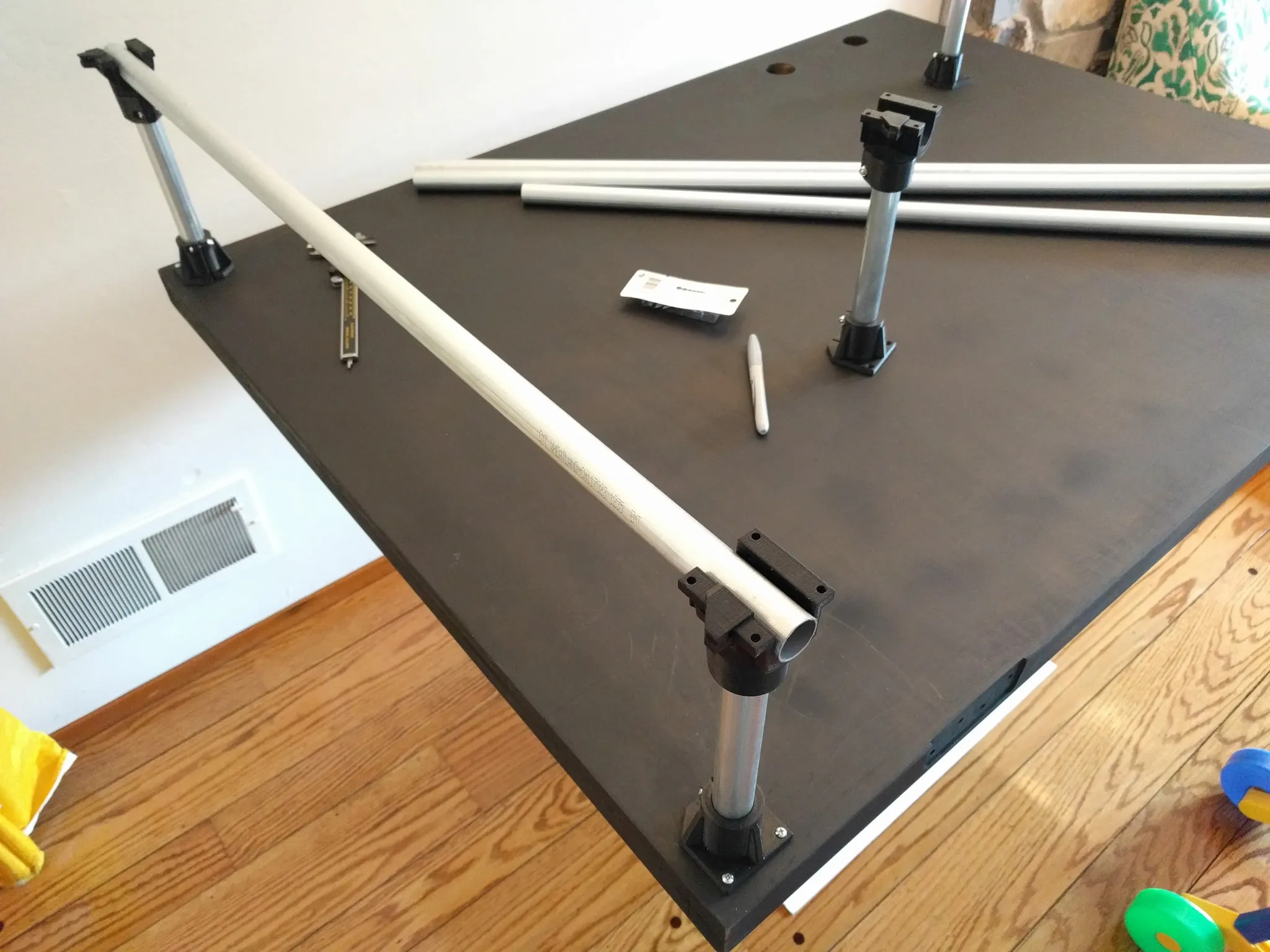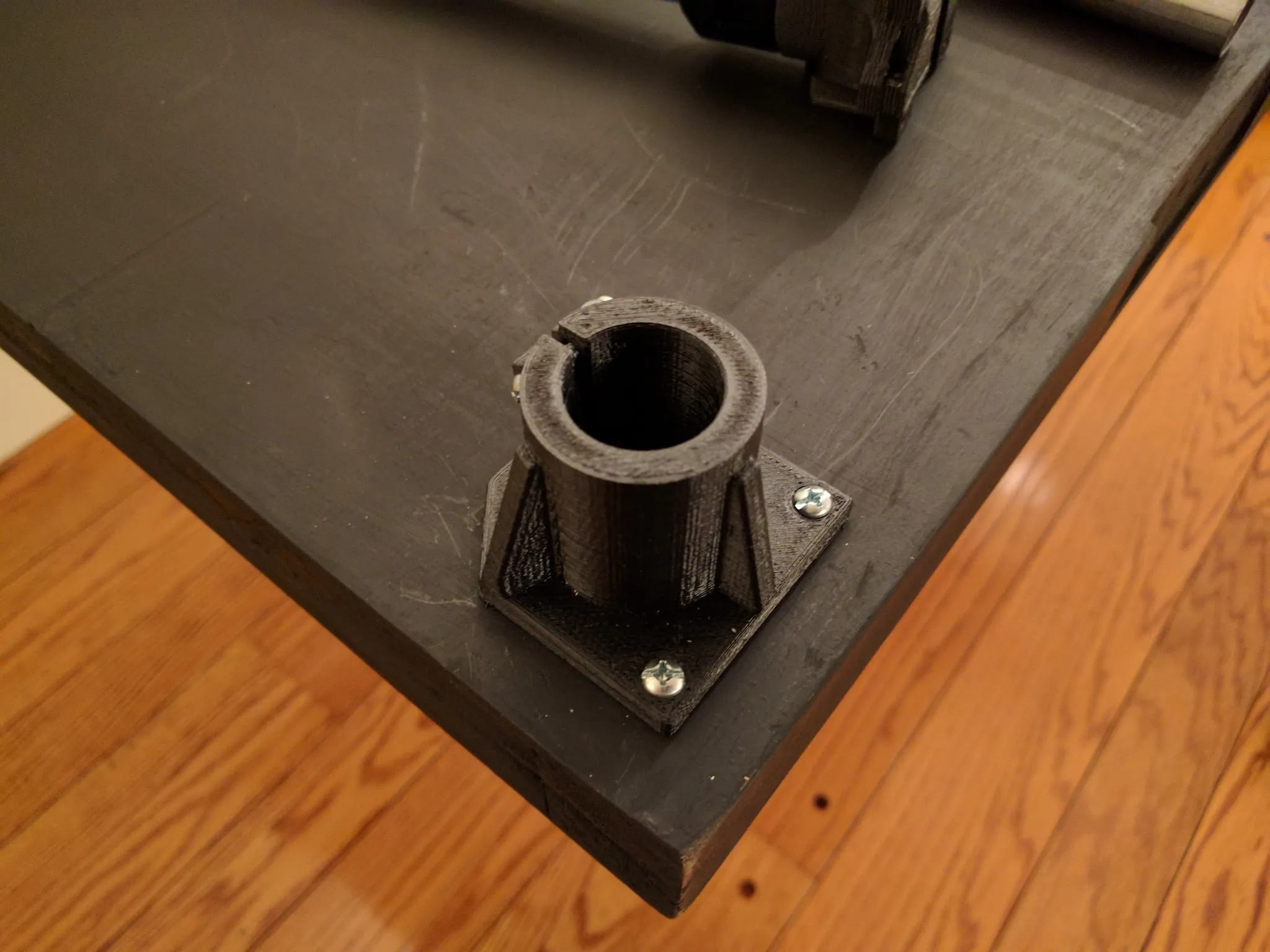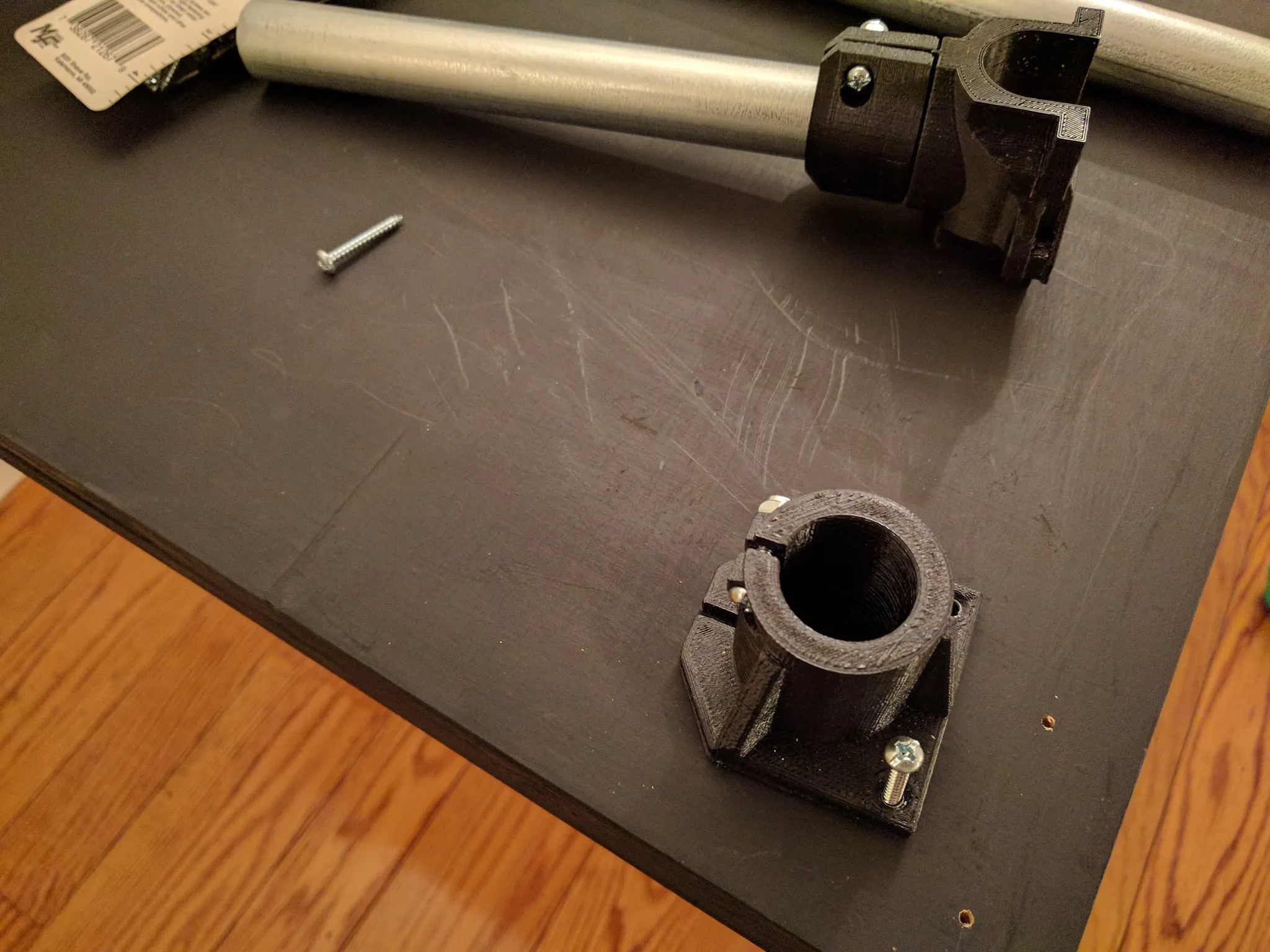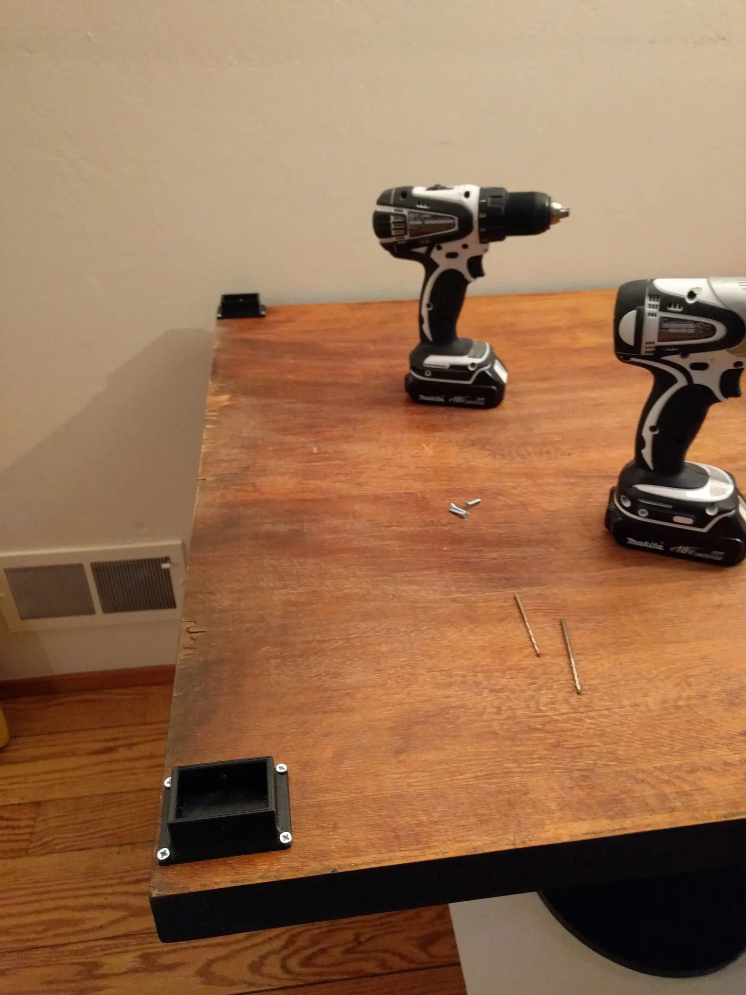 I ended up using an old door I found in the basement and some scrap wood. I printed out these little holders for the legs, but in hindsight, it would have been better to use a more traditional table building method, like a strip of wood lengthwise around the table to which the legs can be bolted.