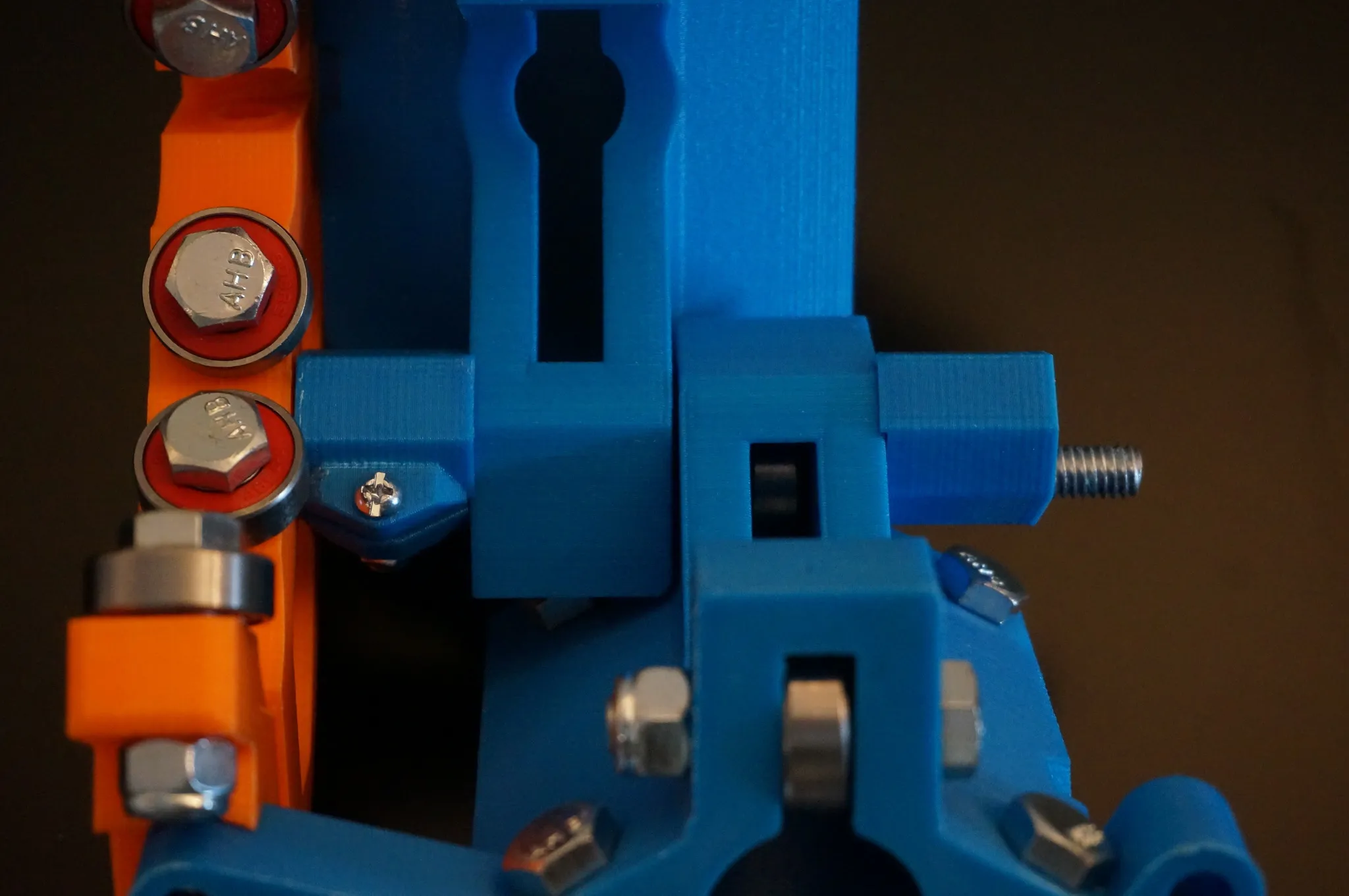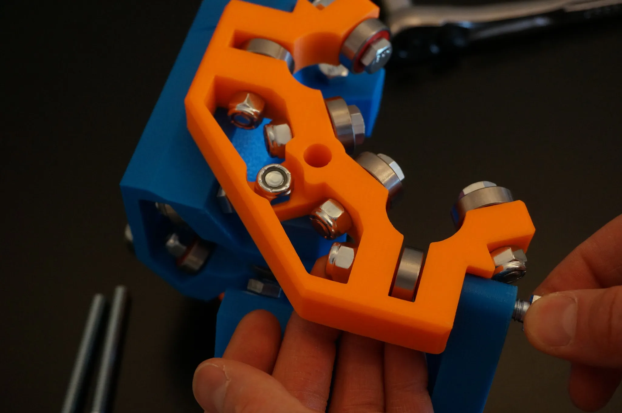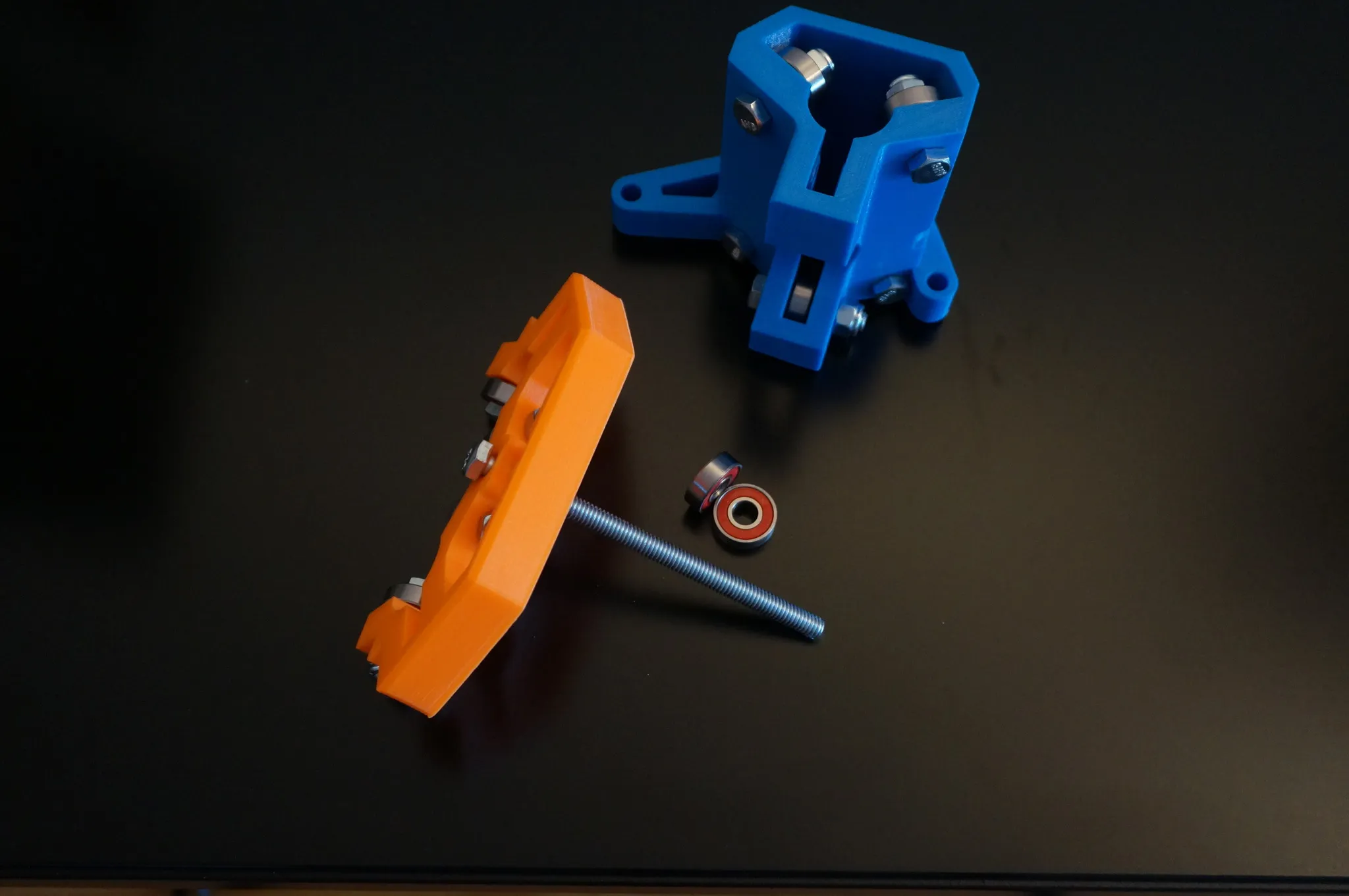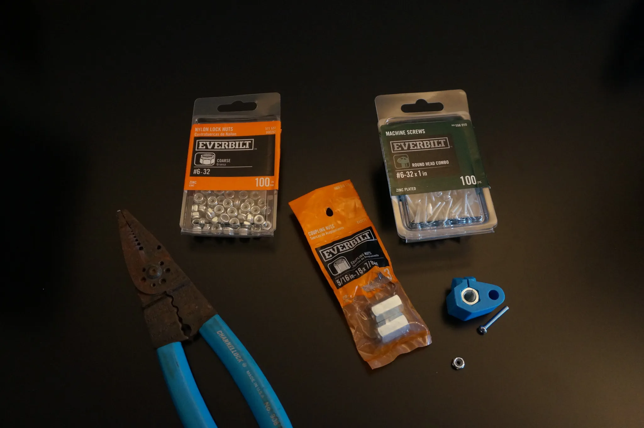 Now find the coupler nut, a small bolt and nut, and the 3D printed part. Install the coupler nut into the 3D printed part.