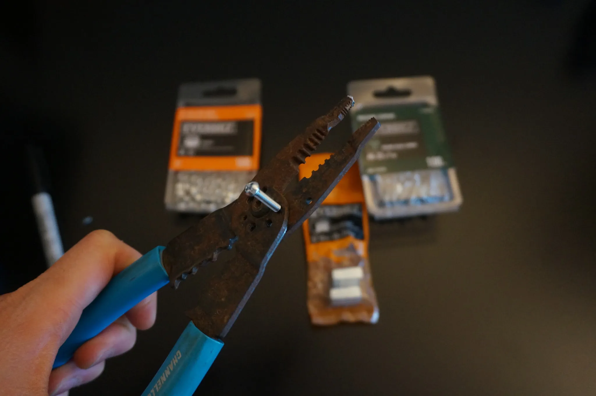 I couldn’t find 1-1/4” bolts locally, so I used 1-1/2” bolts and cut them down with a hacksaw then cleaned them up with a file. I found cutting 5 grooves up from the end was the perfect length.
