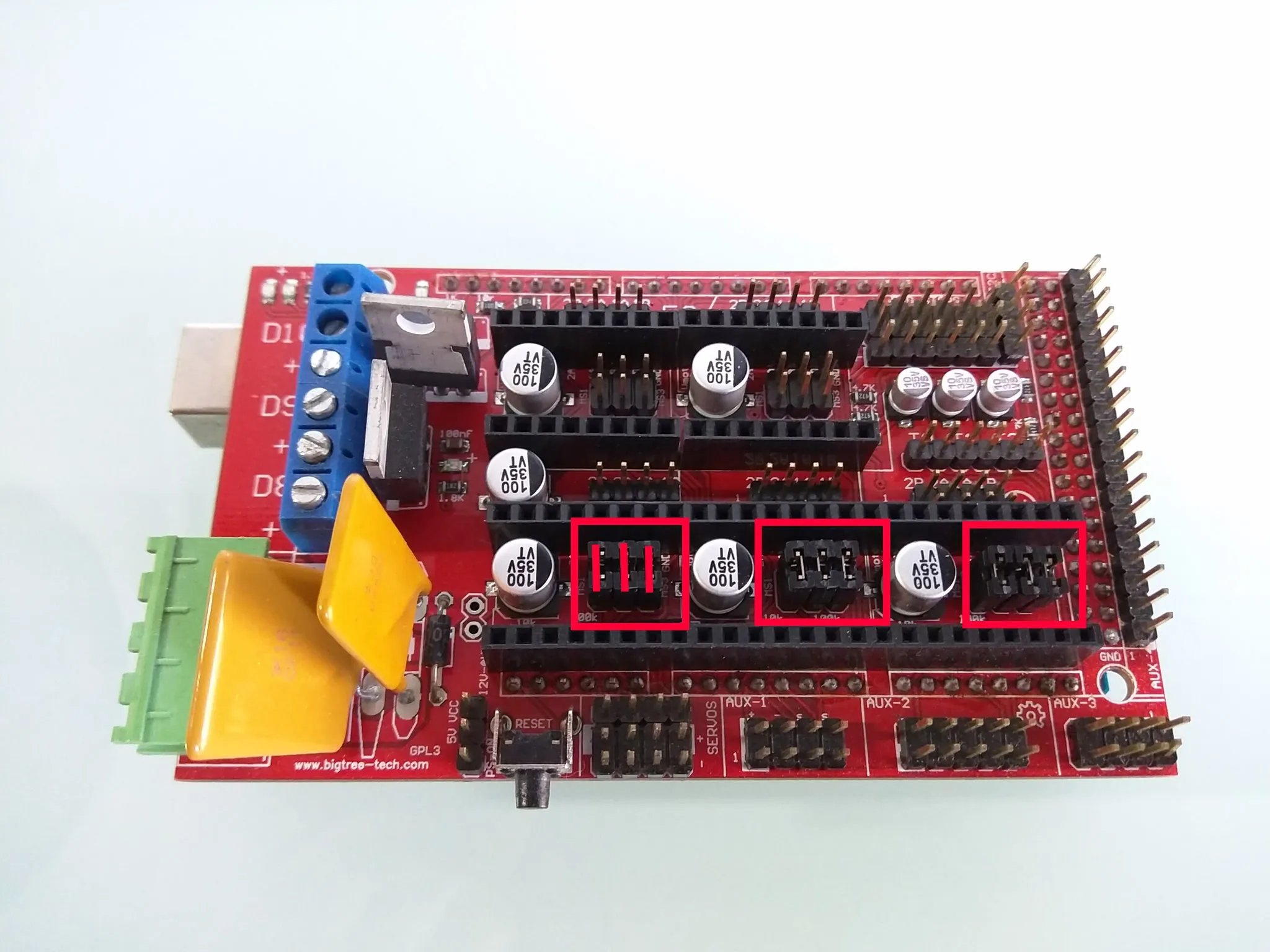 Fill all 3 headers below each motor driver slot you intend to use with 3 jumpers. This will give you the most resolution (microsteps) possible. They should look like this when populated: