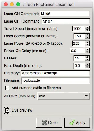 Laser Speed: 300 (for engraving or 150 for cutting with a 2.5w laser)