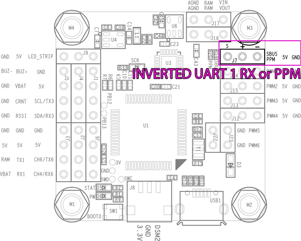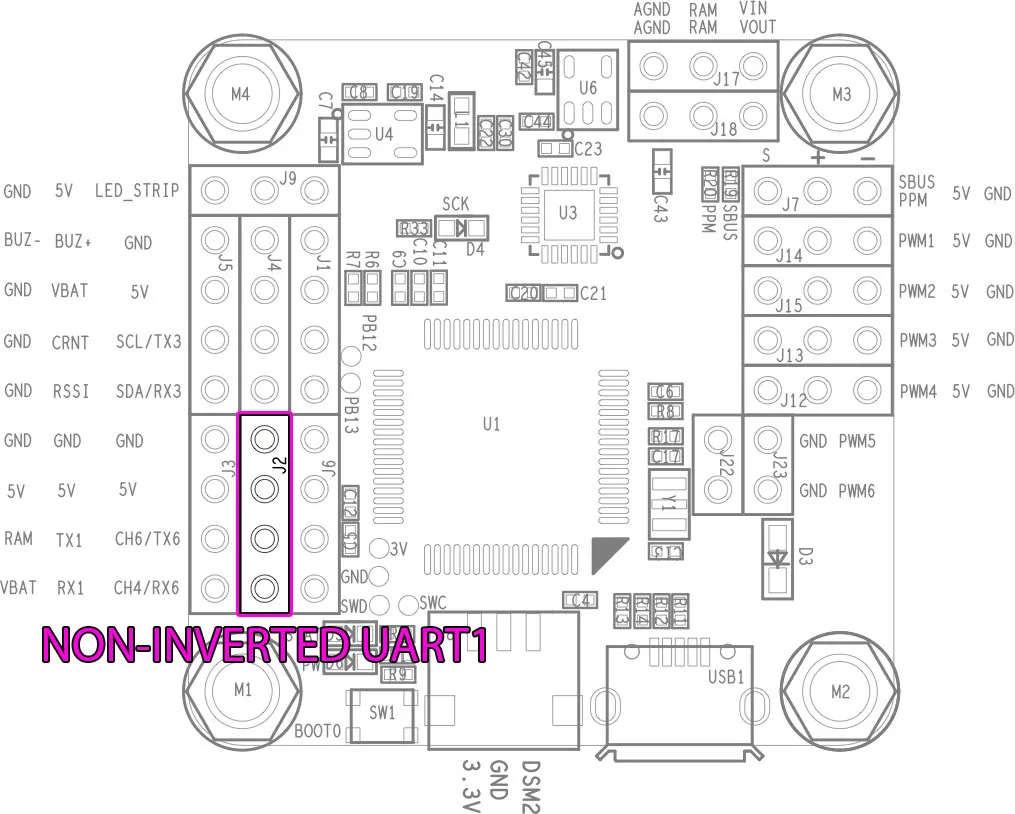 This main input port, shown above, is used for either PPM input or SBUS (inverted). To use UART1 without inversion, use the pin on the lower left-hand side of the board, which does not have an inverter.