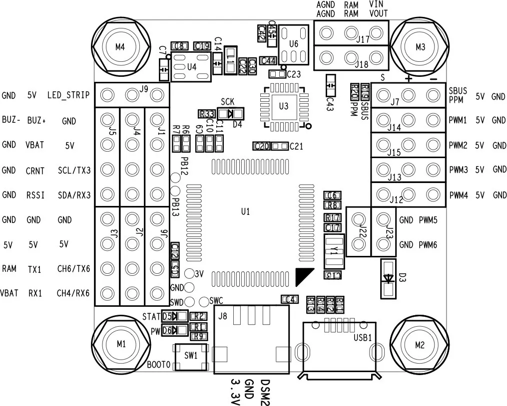 F3 processors have built-in UART (serial port) inversion, which is important for SBUS receivers; however, on the F4 processor, this is not built-in. Therefore, the Omnibus F4 has another component on the board that does serial inversion on the main SBUS/PPM input port.