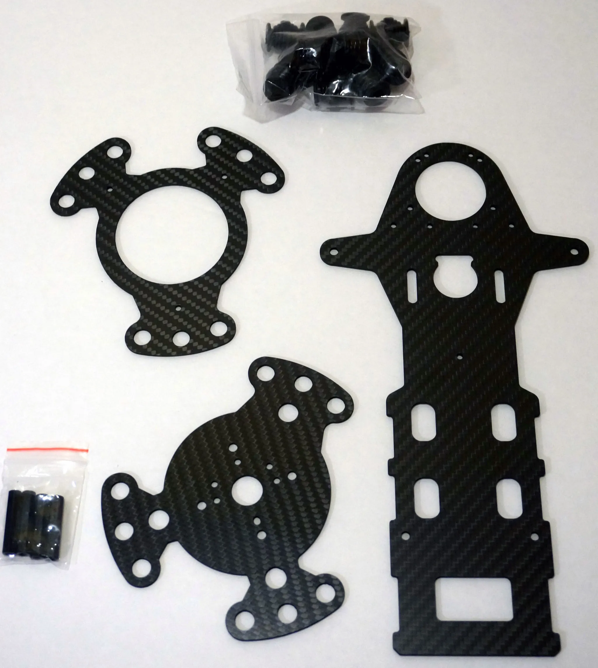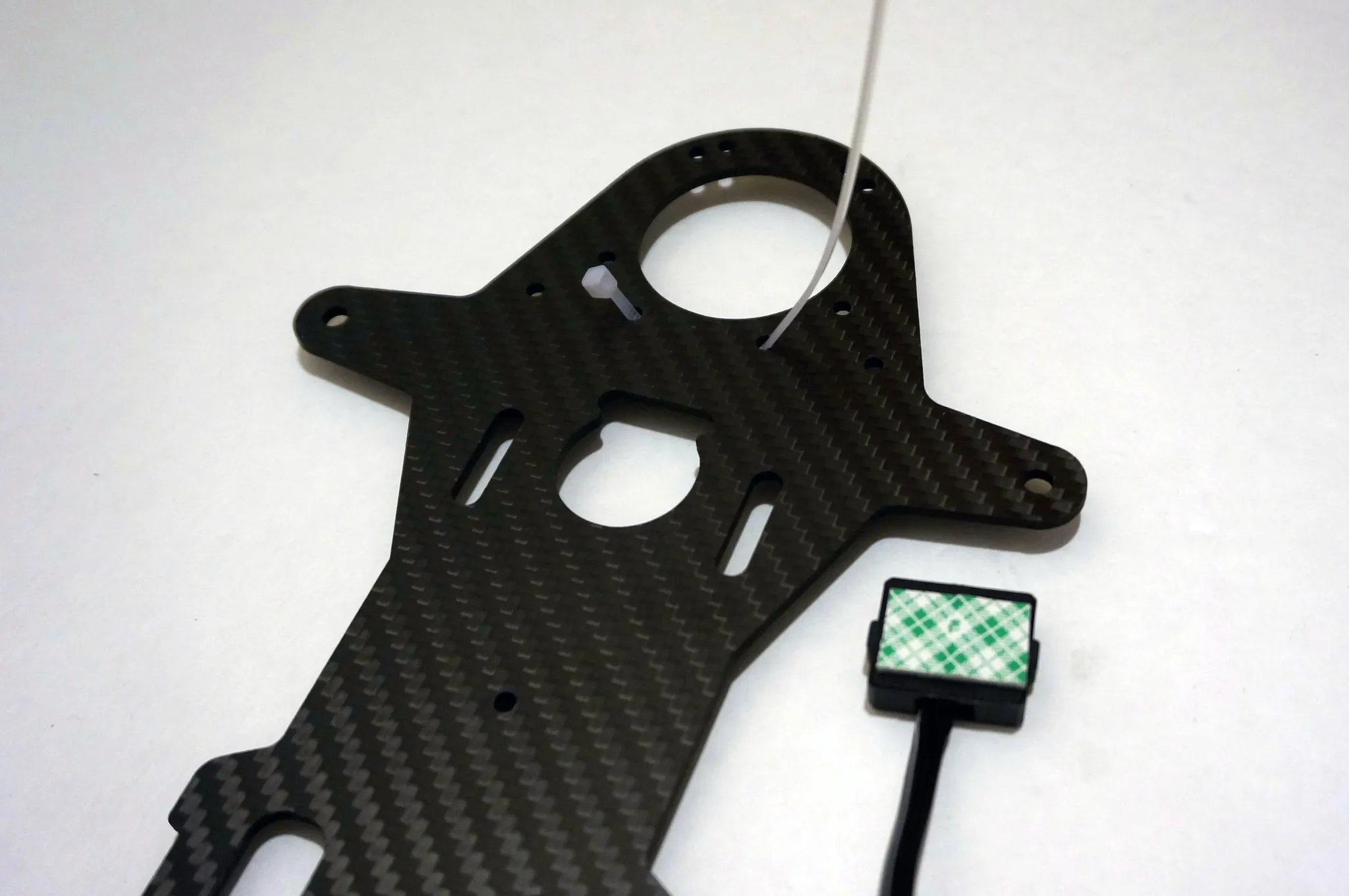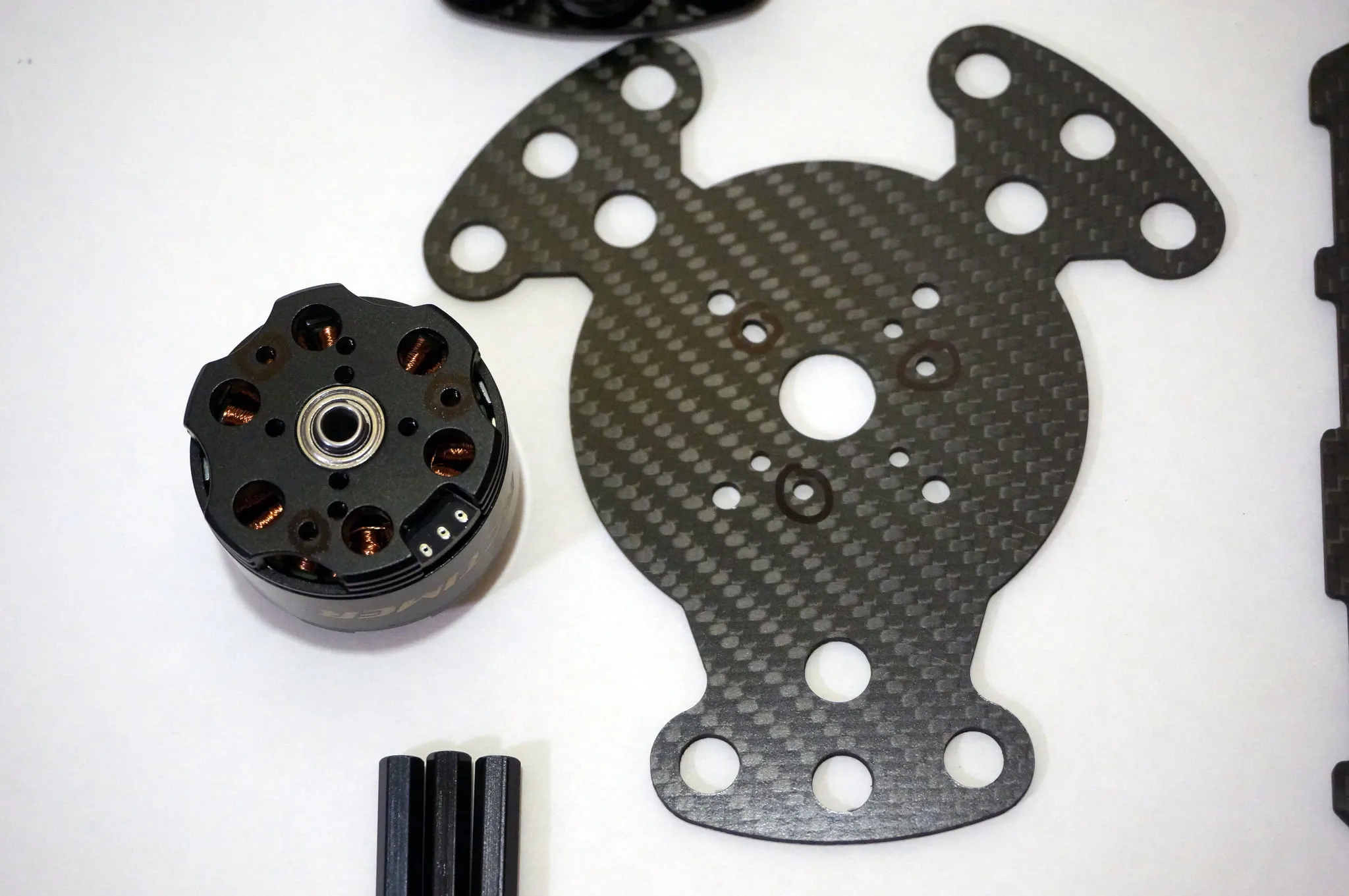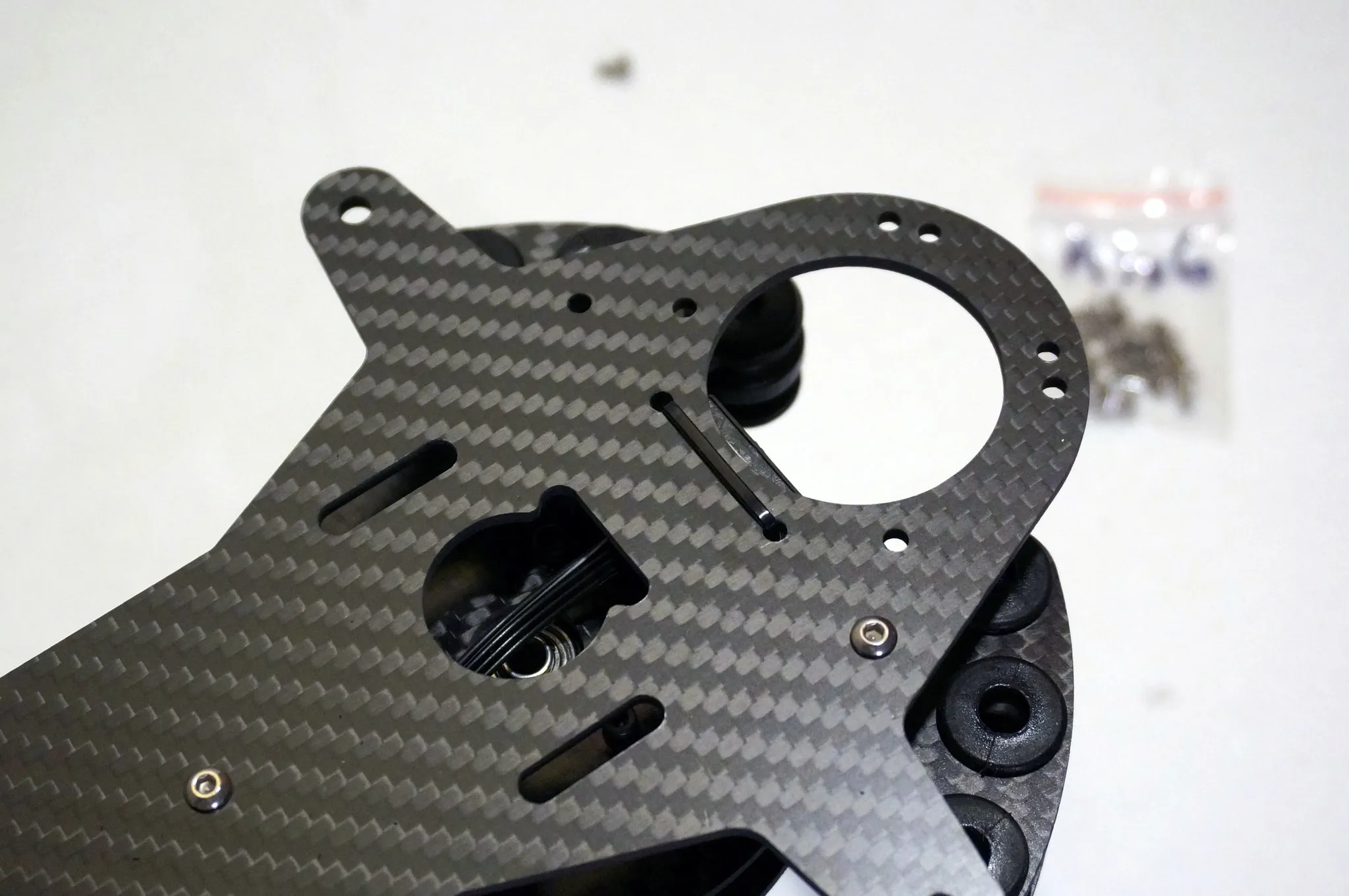 Start from the top and work down, beginning with the carbon fiber mounting plates.