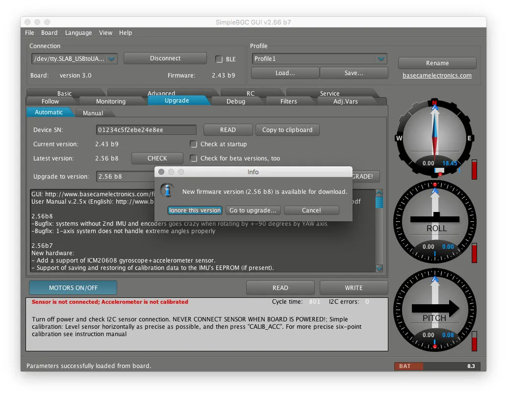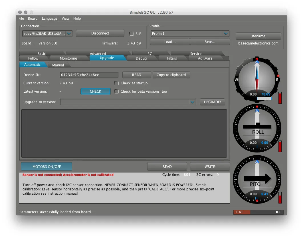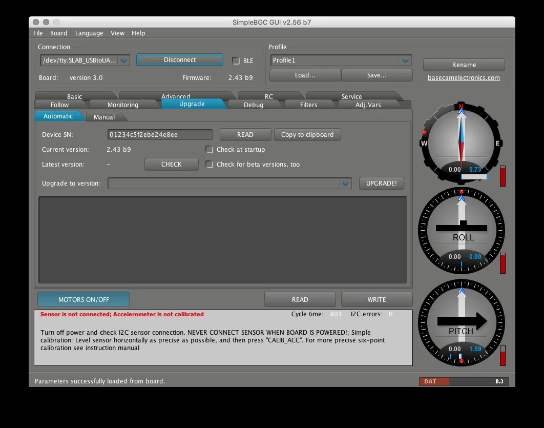 I didn’t create the lock file before I ran SimpleBGC the first time. If you’re like me, unplug your board, close SimpleBGC, create the lock file directory with sudo mkdir /var/lock then set the permissions with sudo chmod 777 /var/lock