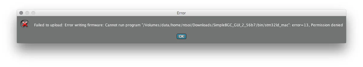 In the SimpleBGC readme, it says to create a lock file directory. Do not skip this, if you do, flashing could fail. In a terminal window, run: