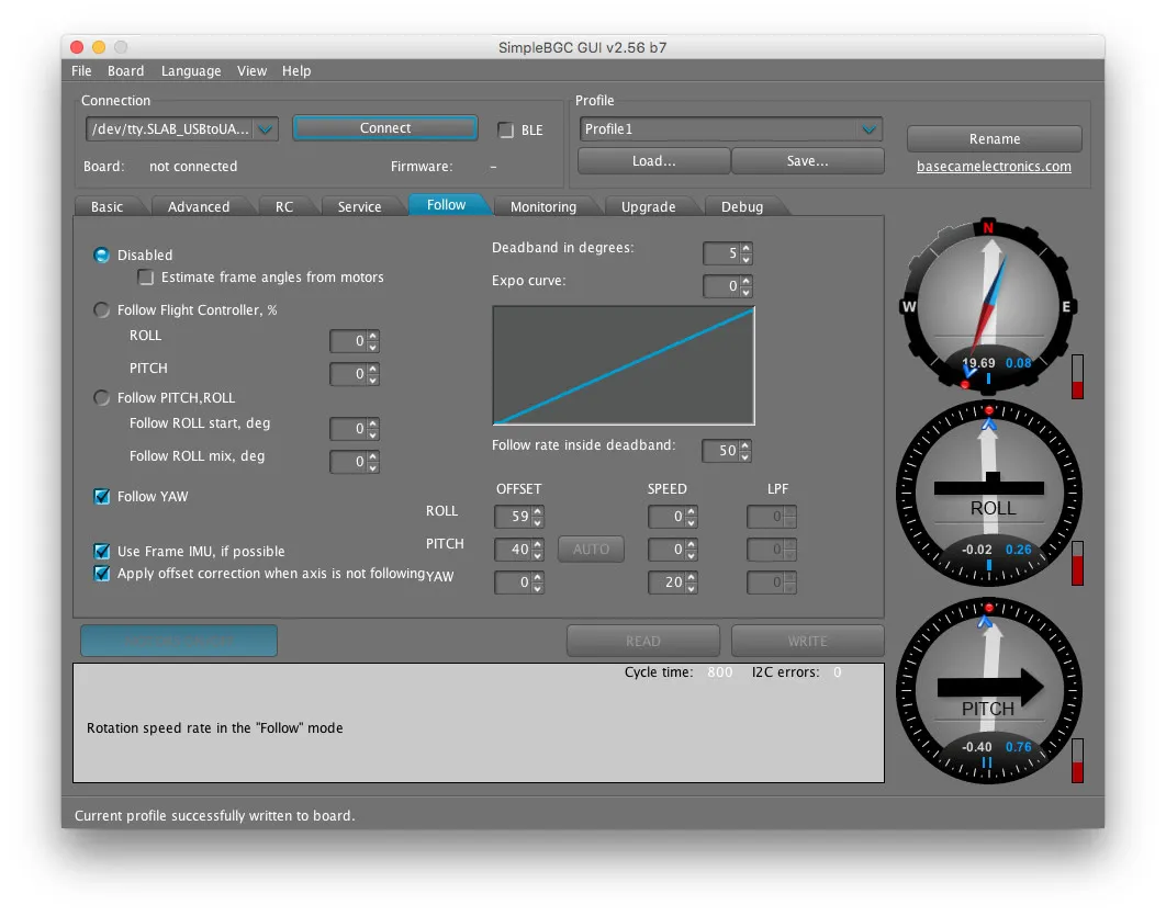 Finally, I checked the box next to Follow YAW and turned YAW SPEED up to 25. This will make the camera turn when I turn the quad-copter.