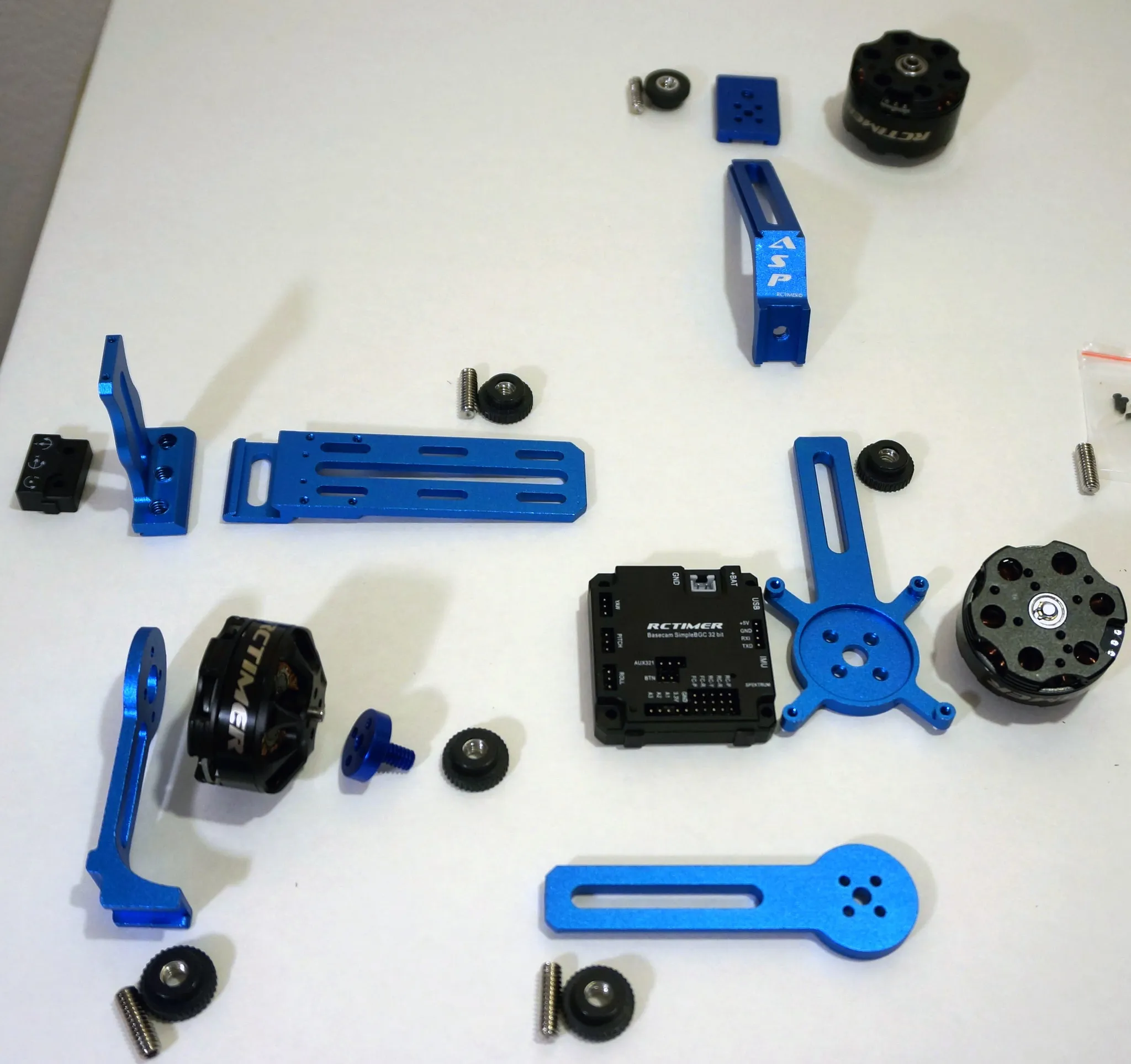 Lay out the pieces like this. The motors, gimbal controllers and thumb screws will be mounted approximately in these locations.