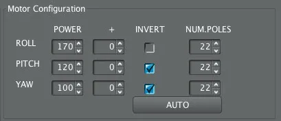 Next, we’ll figure out if any of the motors need to be inverted. Plug a battery into the back of the camera. I used a little 3S battery. Then hit AUTO under the Motor settings.