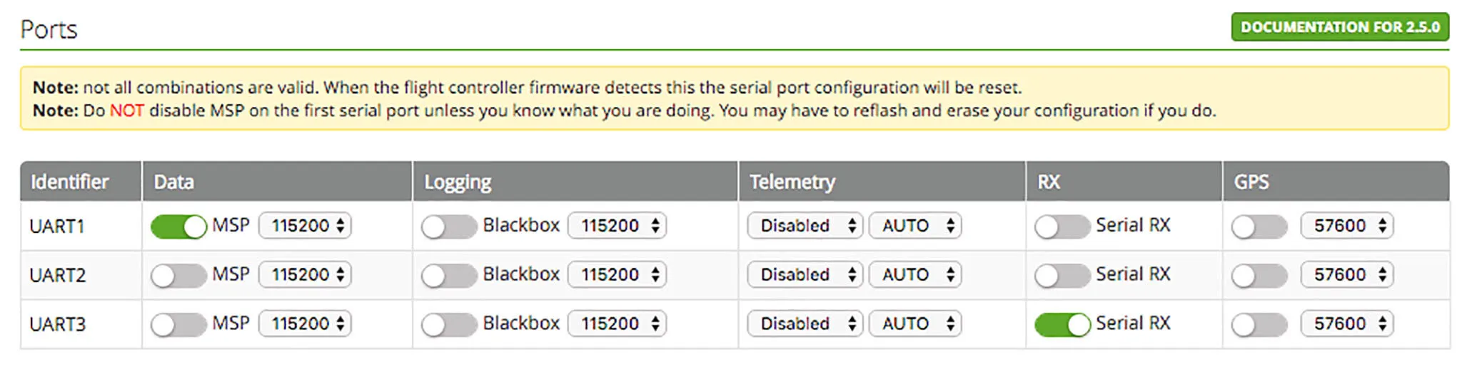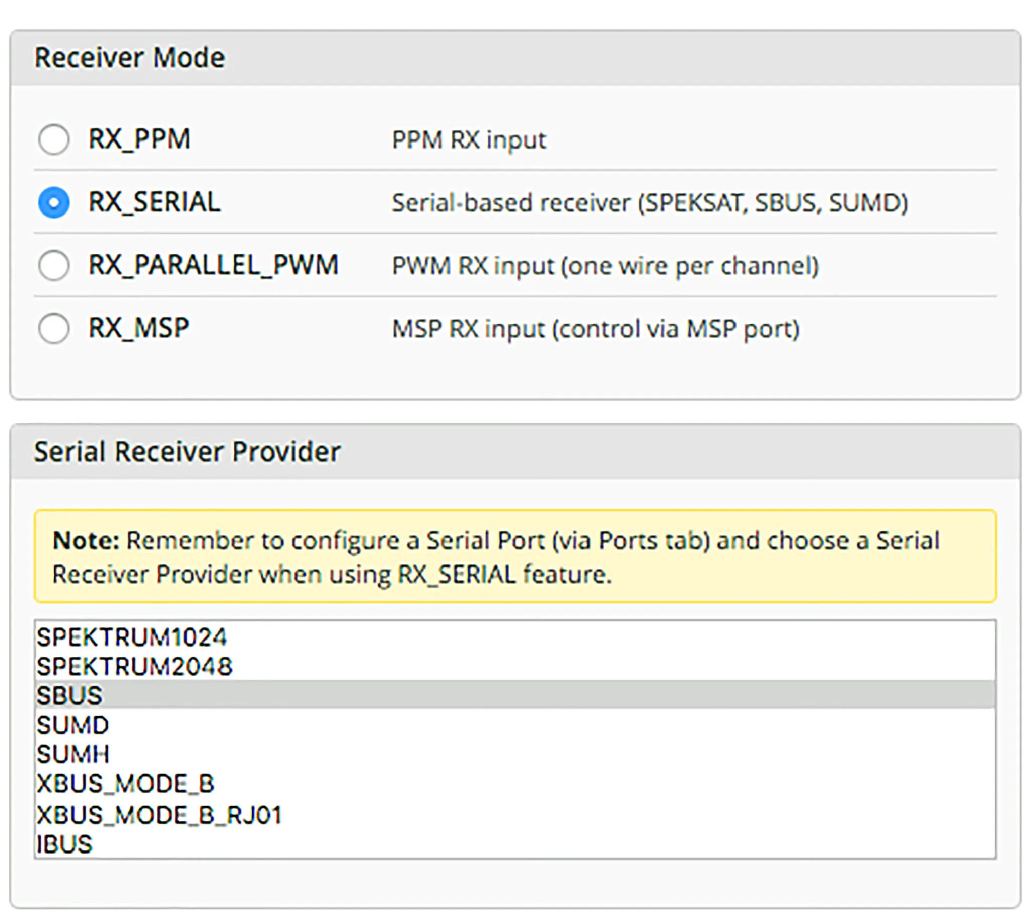 Then on the main settings tab, pick RX_SERIAL in the Receiver mode section and pick SBUS in the Serial Receiver Provider section. F3 boards all have a built-in inverter, so you won’t need an external inverter.