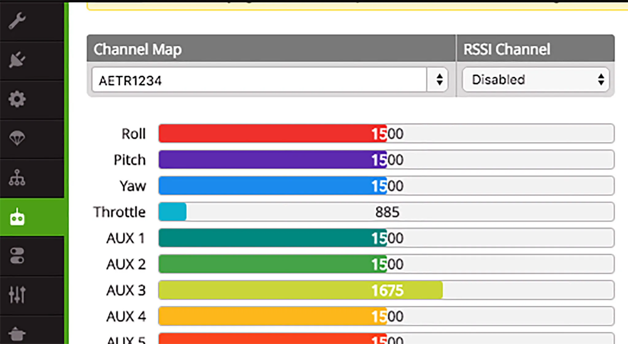 You can test the configuration by powering on your quad and transmitter, then turning off the transmitter and checking the Receiver tab. Notice the throttle channel is at 885 which is below the lowest valid signal value.