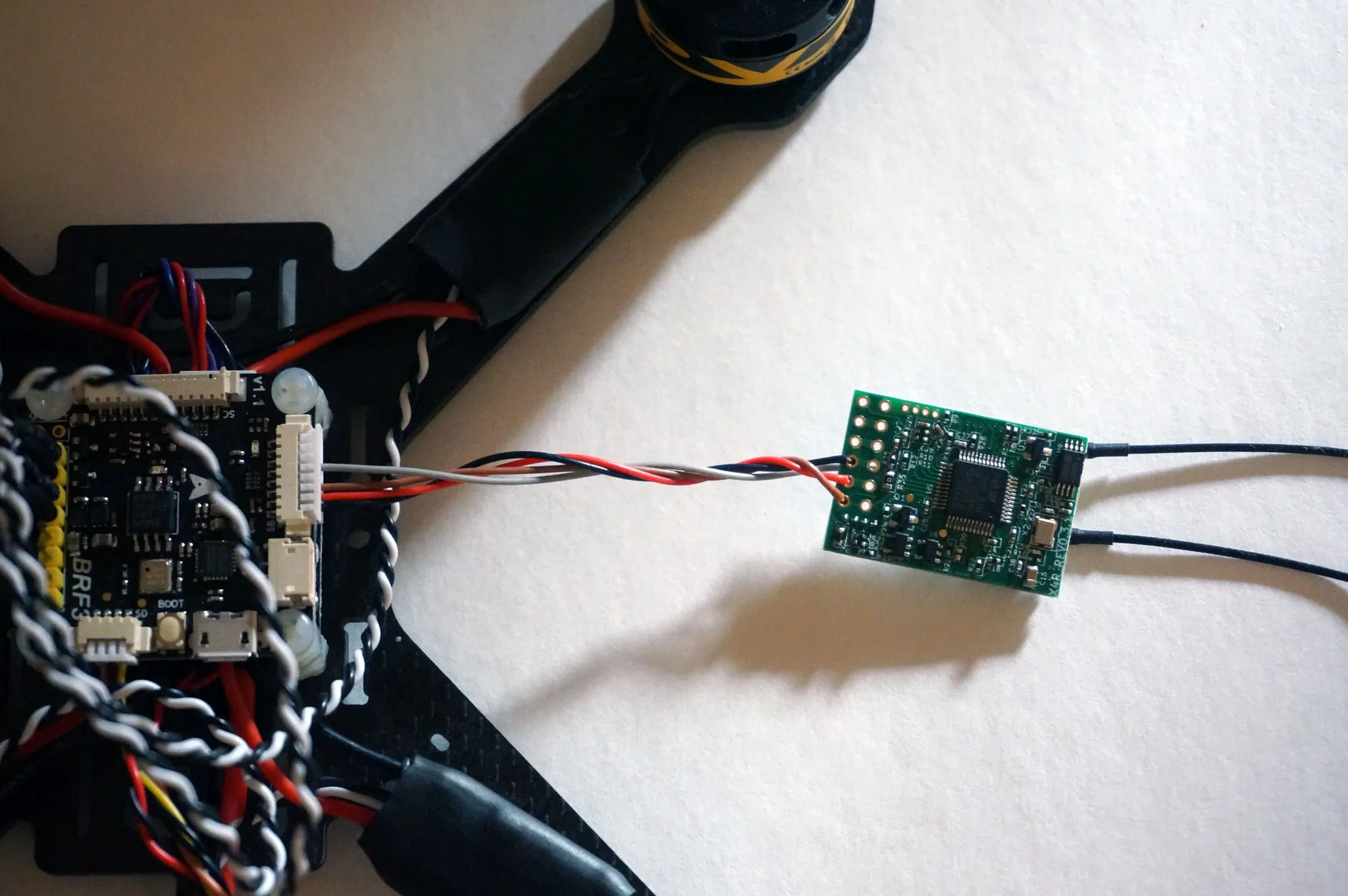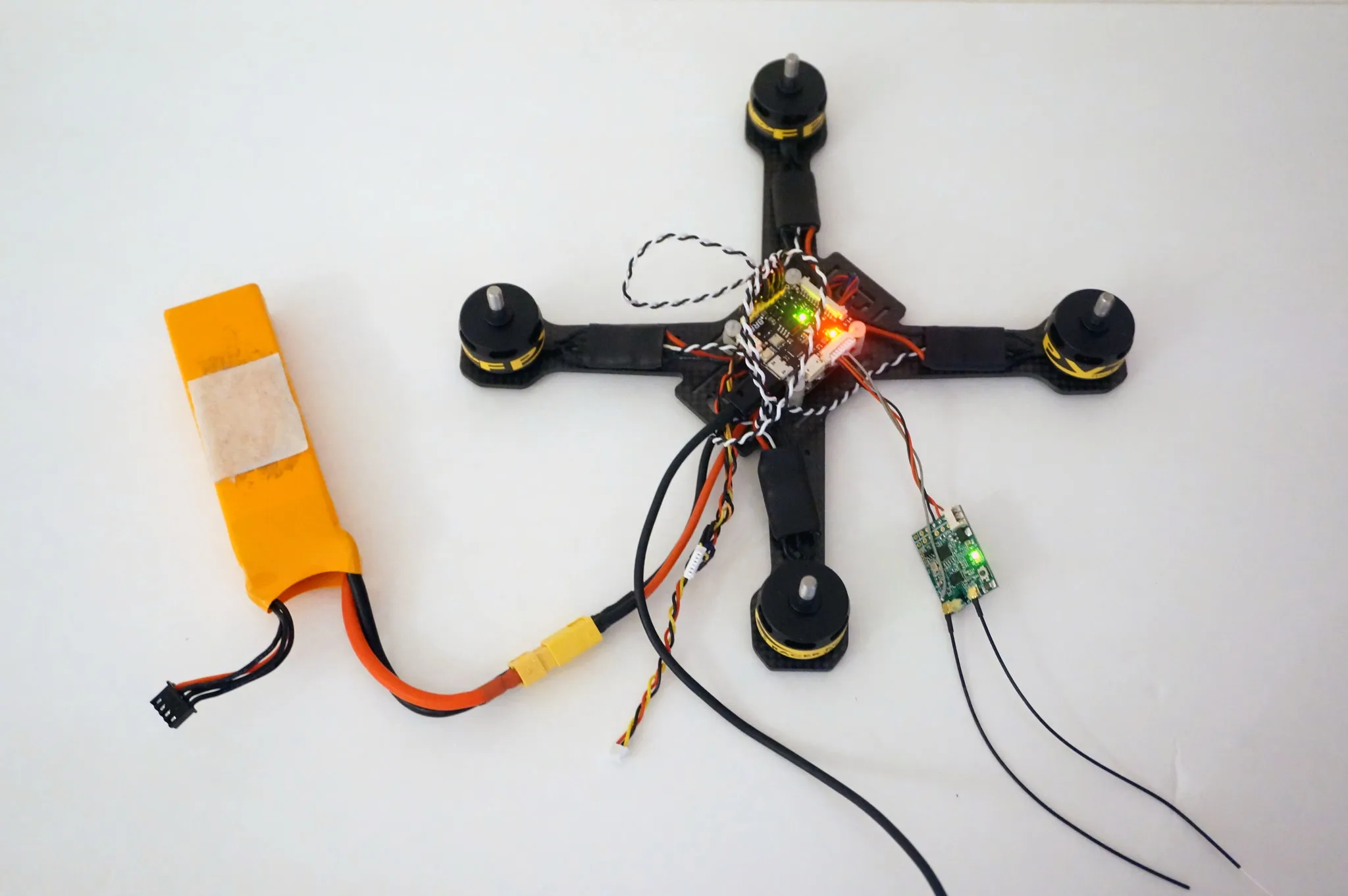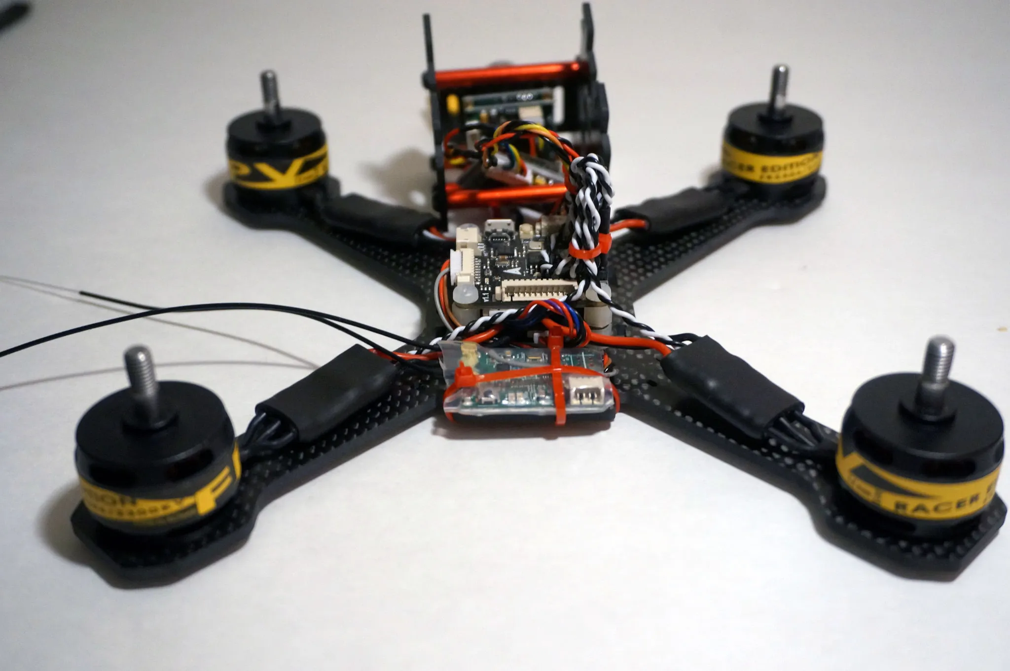 Attach some zip ties, sticking up on the back and then heatshrink your antenna wires to the zip ties. One of my antenna wires is much shorter than the other because of the receiver’s position, but no worries. I kept it symmetric by using zip ties and heatshrink of the same length, even on the shorter side.