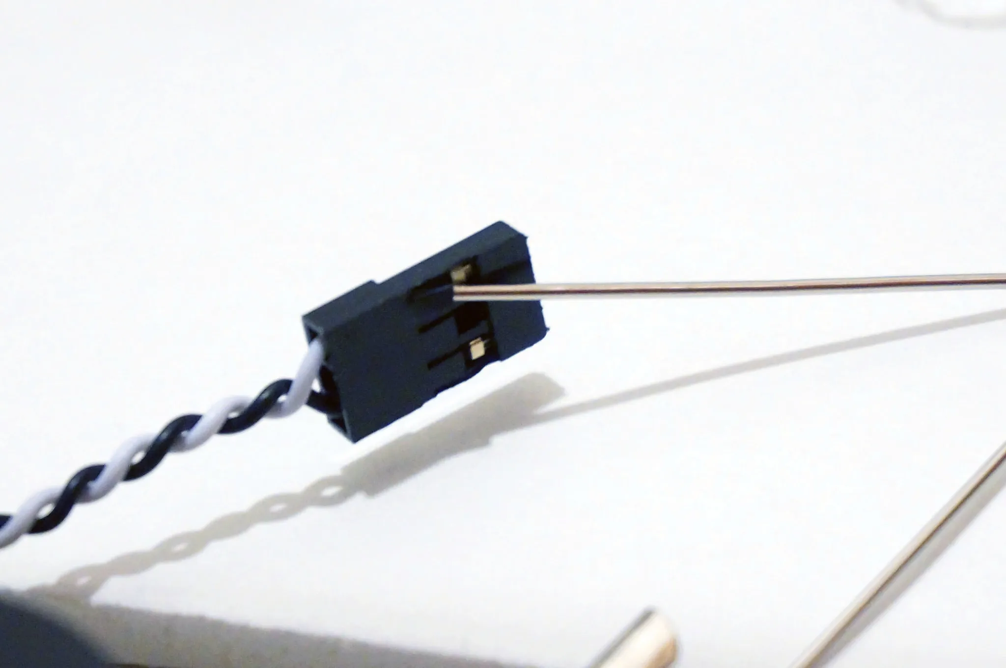 Now remove the ground wire pin header from the plug using a pin, no need to cut this wire. Solder on another small wire to the exposed pin header. This will be our “ground wire extension”: