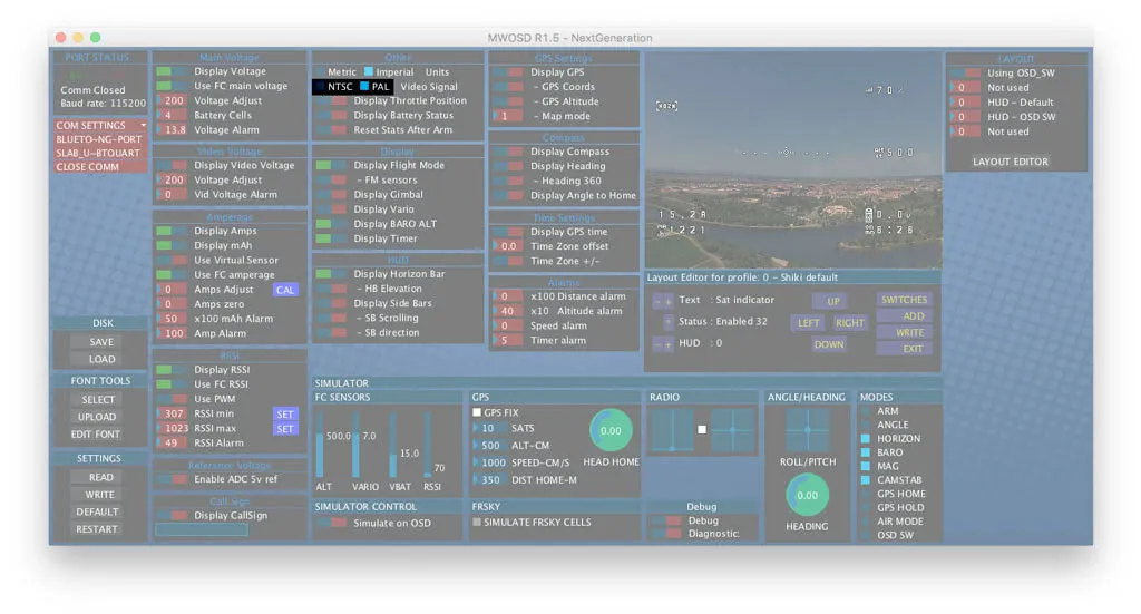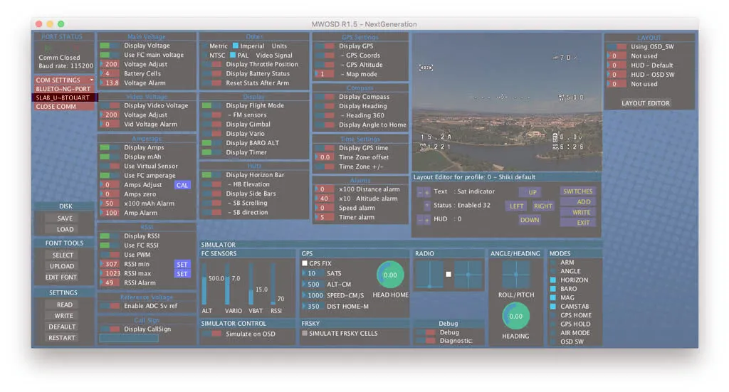 Click the name of the port on the left side, under Port Status to connect to the OSD. All the buttons in this section will go from red to green when connected. Mine is called SLABS_U~BTOUART. The CP2102 must be plugged in before starting the configuration tool, otherwise this button will be missing. Just plugin the CP2102 and restart the app if this is the case.
