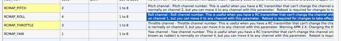 This will allow the values from the transmitter to pass-through the PixHawk. Connect the gimbal’s RC_PITCH and RC_YAW to channels 6 and 7 in the OUTPUT pin group. I also connected channel 8 to the RC_ROLL channel, however I’ll be using this to control the gimbal mode, not the roll, see the configuration below.
