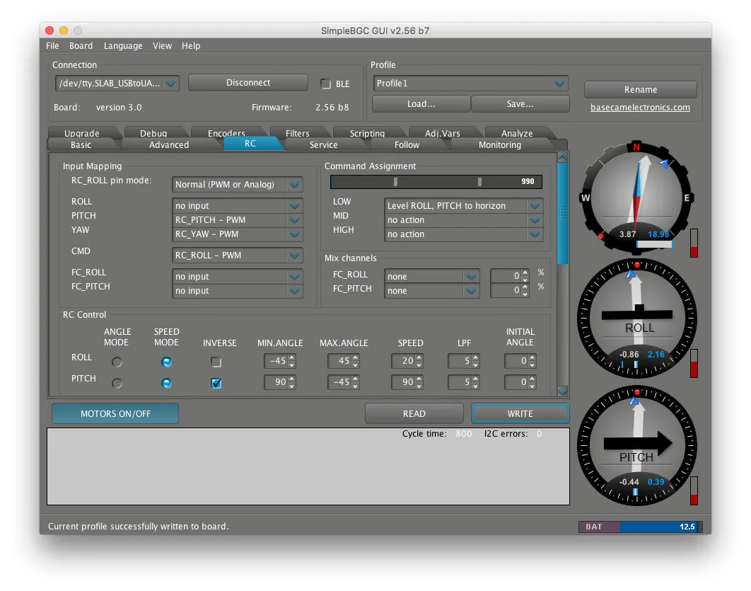 Note that I’ve set the Low command to Level Roll and Pitch to Horizon, this is so the camera keeps it’s normal orientation when the transmitter switch is off. If this were not enabled, the gimbal would stop wherever it was when the switch was flipped from on to off, instead of returning home.