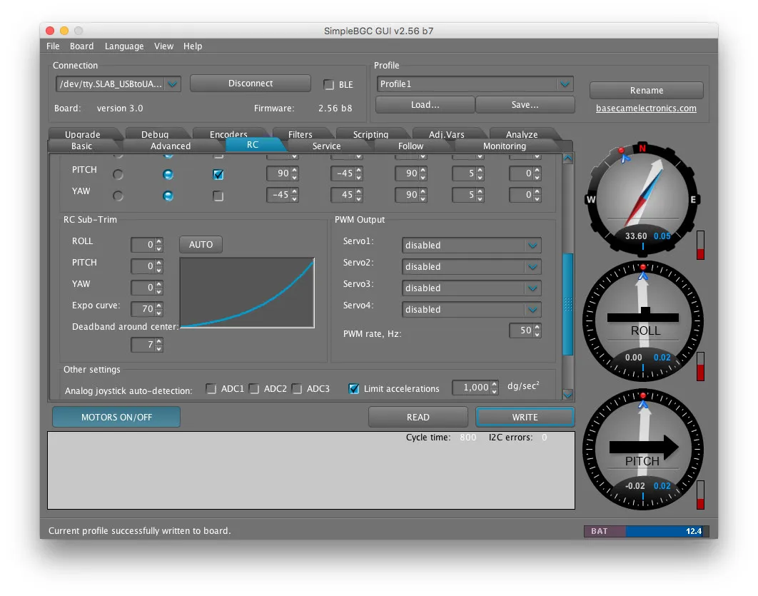 Set pitch and yaw limits along with any channel reversing you want. I also set the expo to 70 and doubled the limit acceleration value, for finer grain control: