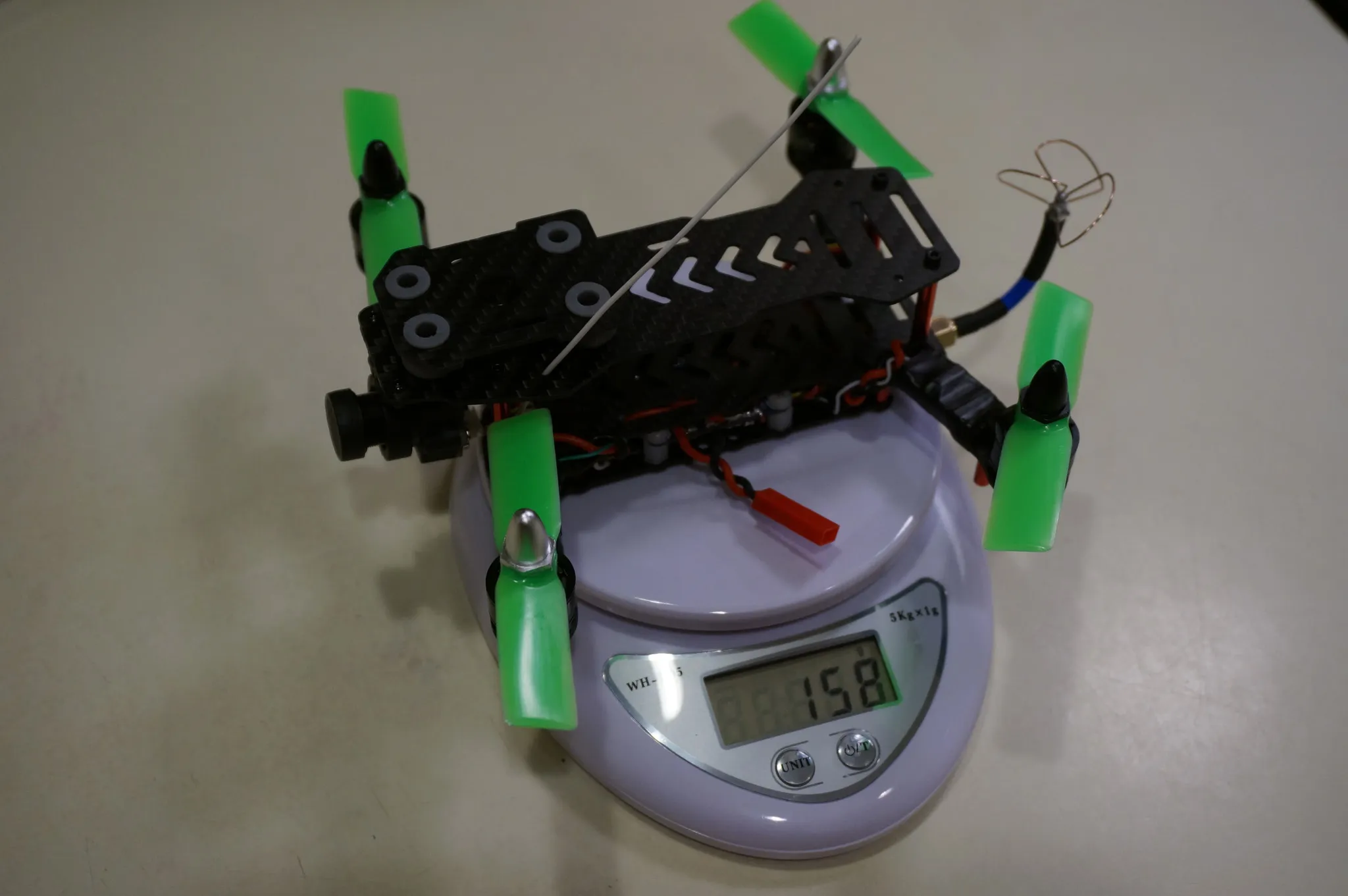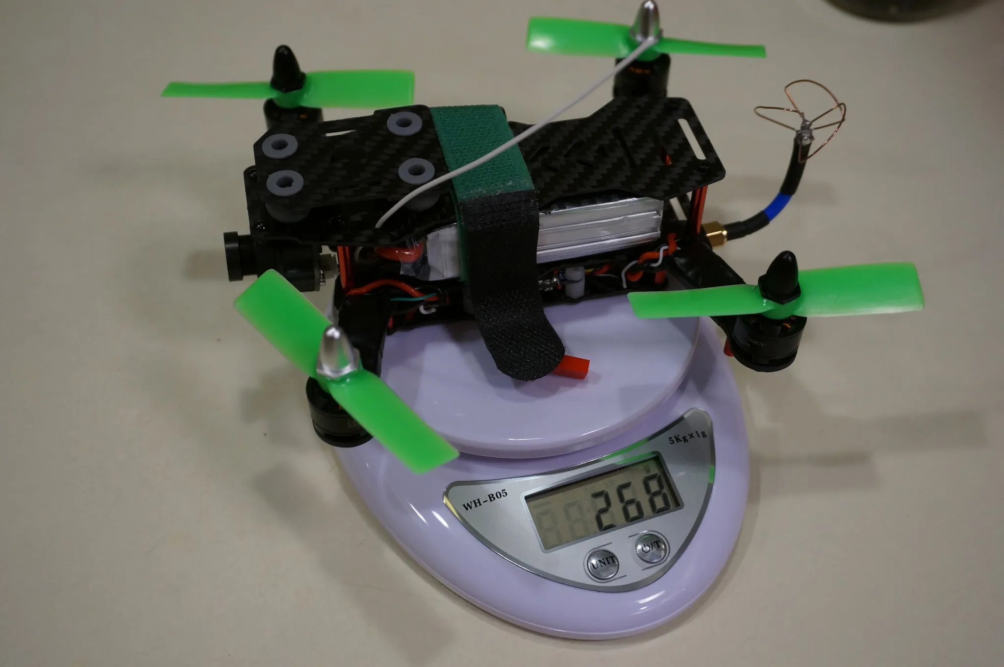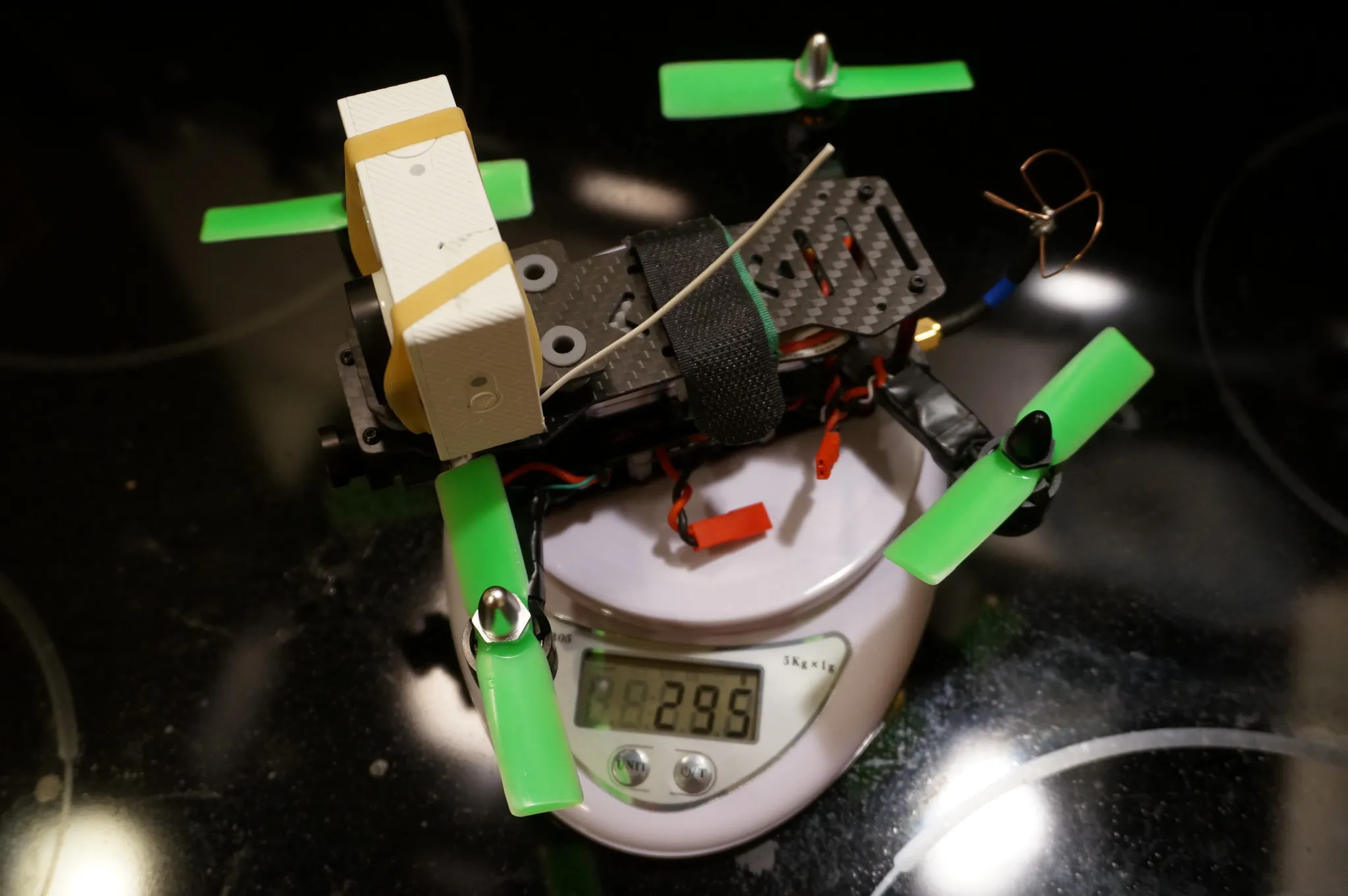 I also fly the Xiaomi Yi Camera on this thing, which bright the all up weight to 295g with a 900mah battery.