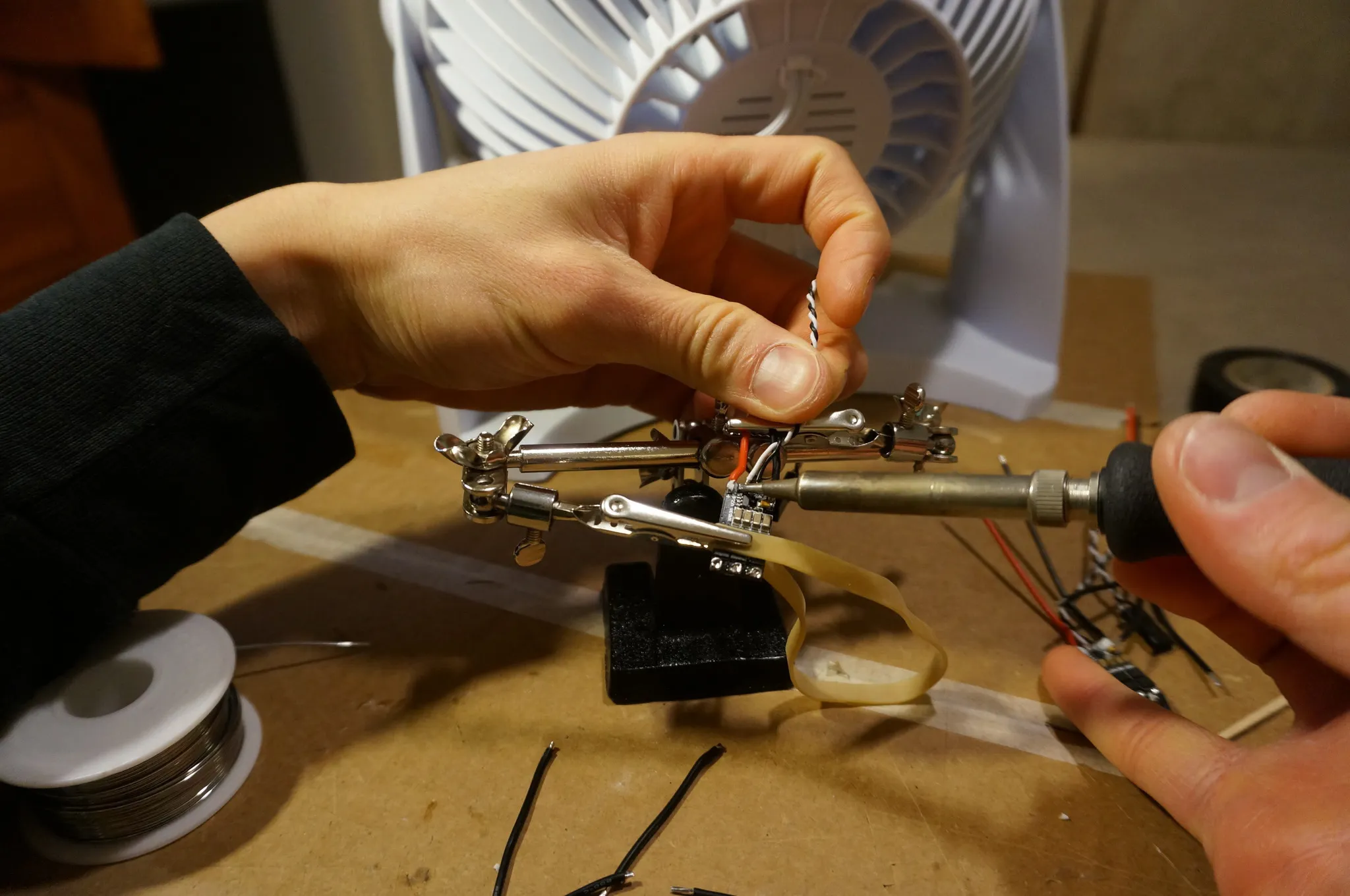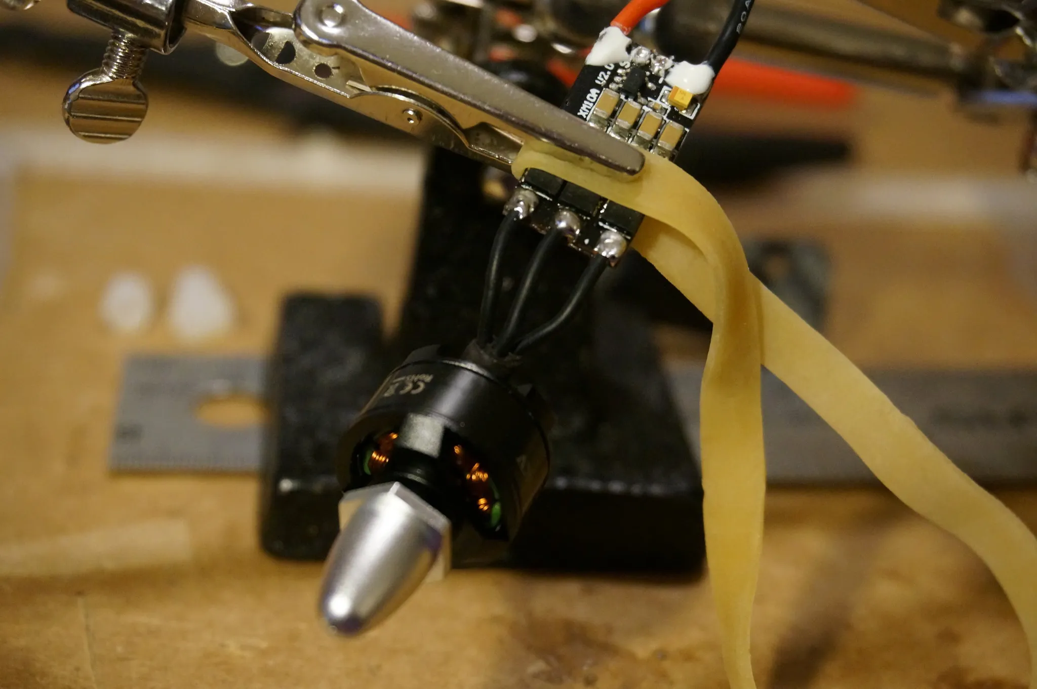 Here I’m using helping hands, but padding the ESC with a rubber band.